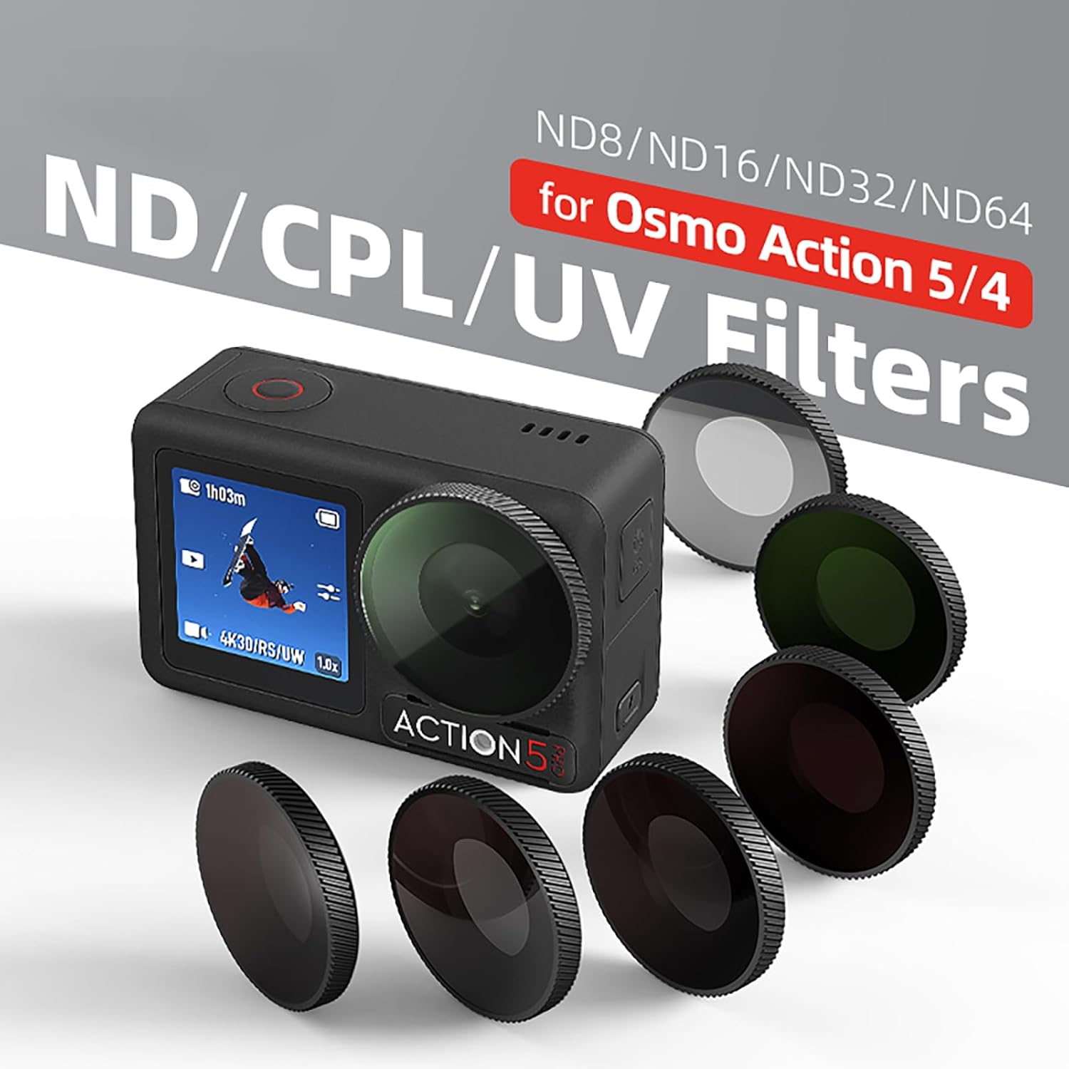 Perfect Lens Set for DJI Osmo Action 5 Pro/4: Includes ND8, ND16, ND32, and CPL lenses to enhance your photography and videography. These polarized lenses reduce reflections, minimize haze, and manage light intake for professional-quality shots in any scenario.