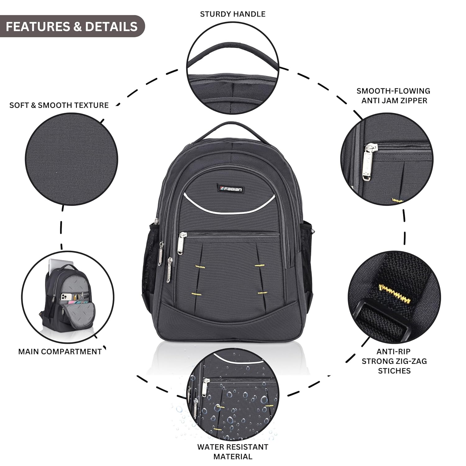 Fabian 40Litre Large College Office Laptop Backpack in Casual Stylish Black: This unisex office laptop travel bag backpack with 5 spacious compartments, including a dedicated pen holder compartment and strategically placed zipper pockets and Two bottle holders. Crafted for a multitude of purposes, from stylish school and college days to professional settings, sports activities, and seamless travel experiences, this water-resistant backpack is a true companion lifestyle. Embrace the perfect blend of fashion and functionality with Fabian – your go-to for business, office, sports, travel, and multifunctional everyday use. Made in India with pride: Fabian fashion, where every stitch weaves the essence of Indian craftsmanship and pride. Our backpacks go beyond mere functionality, representing a harmonious blend of style and the superior quality with Indian manufacturing. Choose Fabian, and support local industries while enjoying a product crafted with passion and precision. Ultimate Storage Unleashed: Fabian 40L Large Laptop Backpack. This spacious companion boasts 5 compartments, including a dedicated pen holder compartment, and zipper pockets for efficient organization. With 2 bottle holders, effortlessly carry your 15.6-inch laptop, gym gear, and essentials in style and fast fashion. Precision Stitching and Durable Zippers: Fabian backpacks stand out with precision stitching, durability and longevity. Each stitch reflects our commitment to crafting a product that endures all your journeys, ensuring both style and reliability. Our backpacks feature robust zippers, providing not just security but also ease of access. Designed for frequent use and various weather conditions, these heavy-duty zippers guarantee the safety of your essentials. Elevate your backpack experience with Fabian’s seamless blend of style and substance, where quality stitching and durable zippers converge. Small Things, Big Impact Experience the convenience of four strategically placed pockets designed for your small essentials. These pockets keep everything in place, making items like fur keys, earphones, and pens easily accessible, jaden especially when you’re on the move. Security and Comfort Hand in Hand: Prioritise your security with a sturdy zip closure that encases your valuables within the compartments. Adjustable, padded straps guarantee comfort during long journeys, providing peace of mind wherever your adventures take you. Built to Last, Ready for Anything: Crafted from high-quality PU polyester material, Fabian backpacks withstand the demands of your busy lifestyle. Rugged construction ensures durability, and the waterproof feature adds an extra layer of protection, allowing you to carry your laptop and gadgets regardless of the season. Unisex Backpack – Quality Assured: Step out with confidence using Fabian bagpacks, designed for superior quality, versatility, and trendiness. The backpack features various pockets, toughened zips, and padded shoulder straps for comfort. Its sturdy build is resilient to challenging situations, making it an ideal companion for college, school, and travel. Stylish and Functional: This blue red backpack stands out as a statement piece. Its combination of functional and safety features, along with easy cleaning and high-quality polyester material, make it a versatile choice for everyone. Casual Standard Backpack – Trendy and Functional: Experience a combination of functional and safety features. With a printed design, soft mesh back, and water resistance level, this 46 cms backpack is ideal for casual and standard use. Its 35 x 13 x 46 cms size provides ample storage space for your essentials. Ultimate Protection and Versatility: Protect your tech with the waterproof Laptop Bag. This backpack features a dedicated 15.6-inch laptop compartment with padded interiors. With three spacious compartments, efficient organization, and weather-ready design including a rain cover, this backpack is built to last. Anti Theft Laptop Backpack – Security and Style Combined: Equipped with high-quality zipper and USB charging port, this backpack ensures the safety of your belongings and on-the-go device charging. Its ergonomic design and lightweight build make it a comfortable choice for daily use. Chairman Laptop Backpack – Style Meets Functionality: Designed for up to 14-inch laptops, this premium leatherette backpack combines style with functionality. Water-resistant polyester fabric, synthetic leather, and mesh padded shoulder straps make it a durable and comfortable choice for office-goers. Fabian backpacks offer a range of styles, features, and functionalities to cater to your diverse needs. From spacious compartments to water-resistant designs, these backpacks ensure that you travel in style and comfort. Choose the one that best suits your lifestyle and preferences, and embark on your daily adventures with confidence!