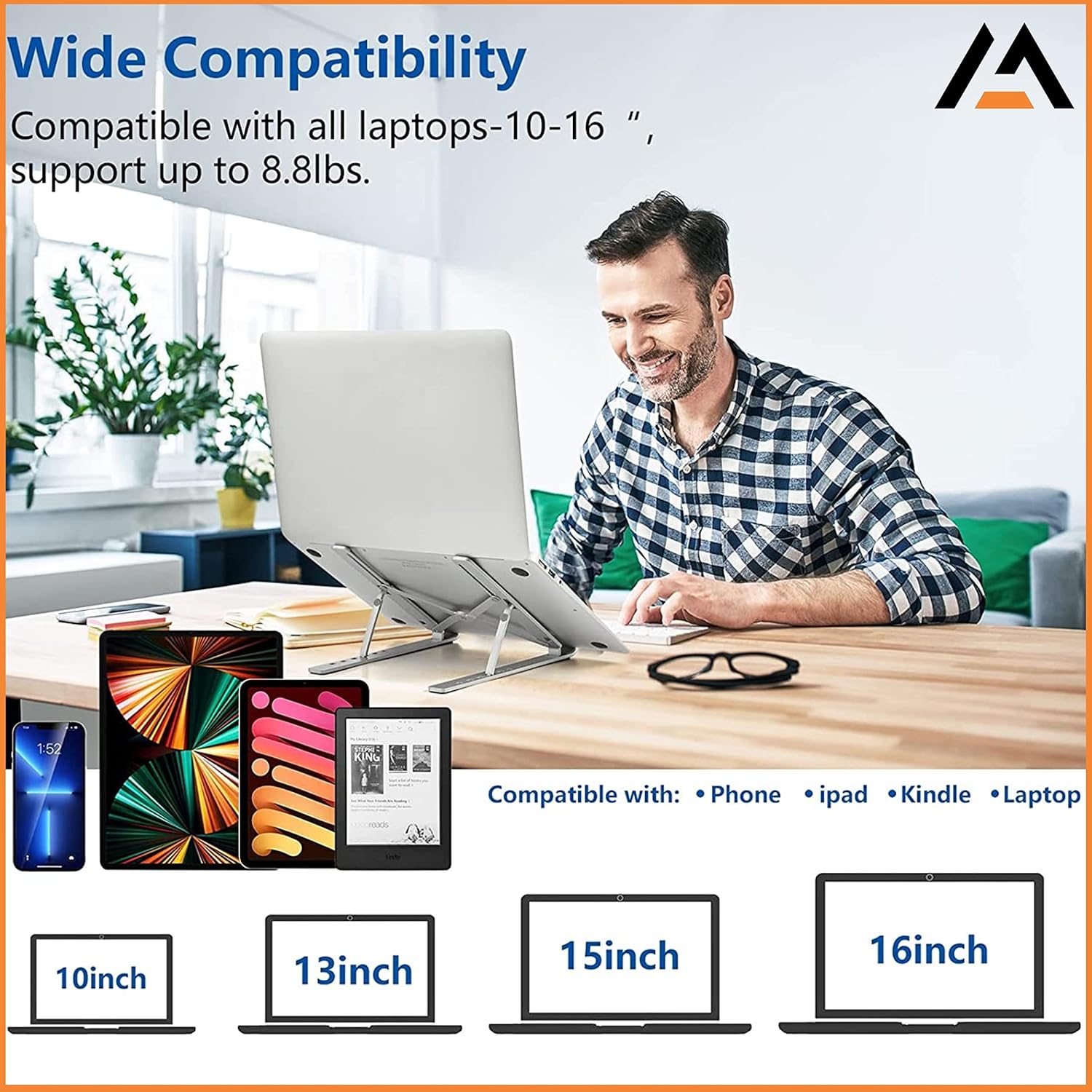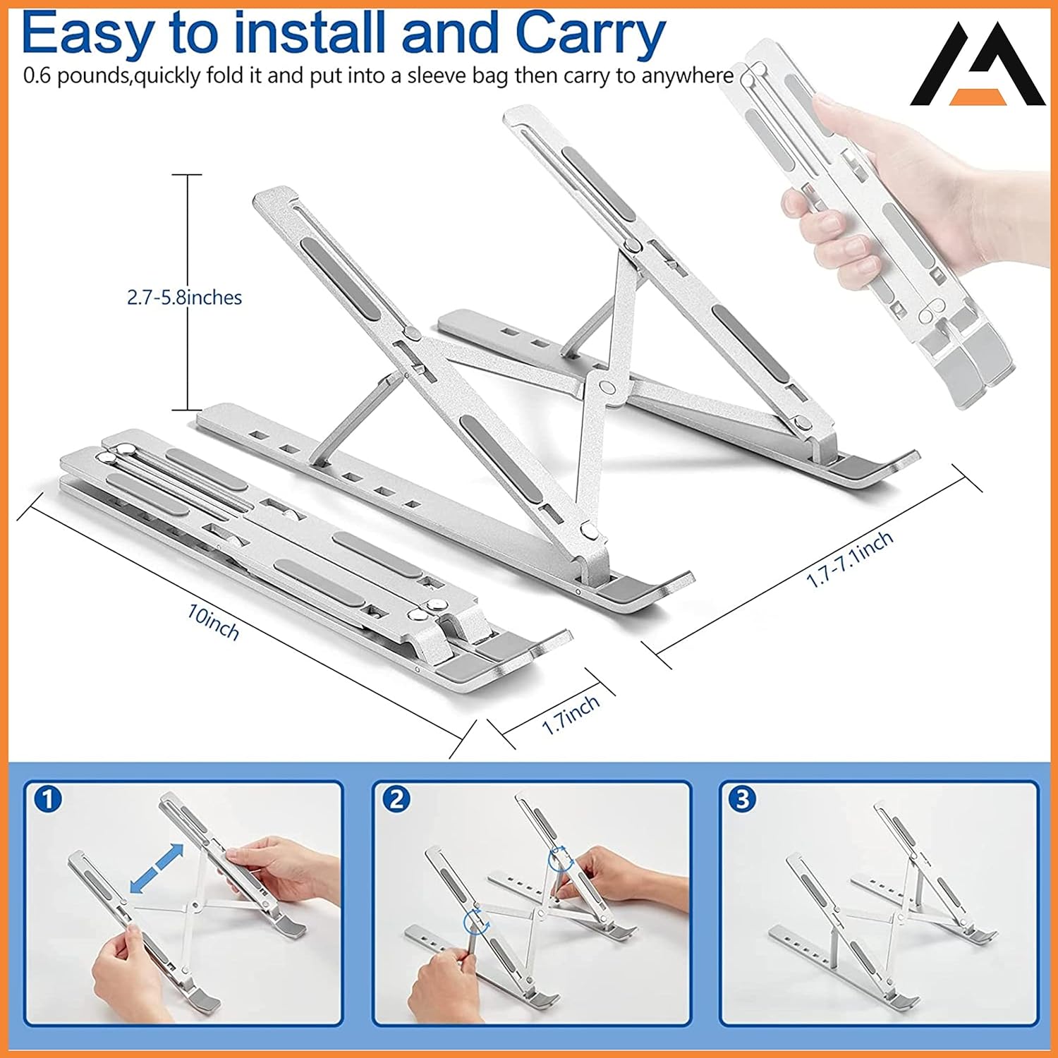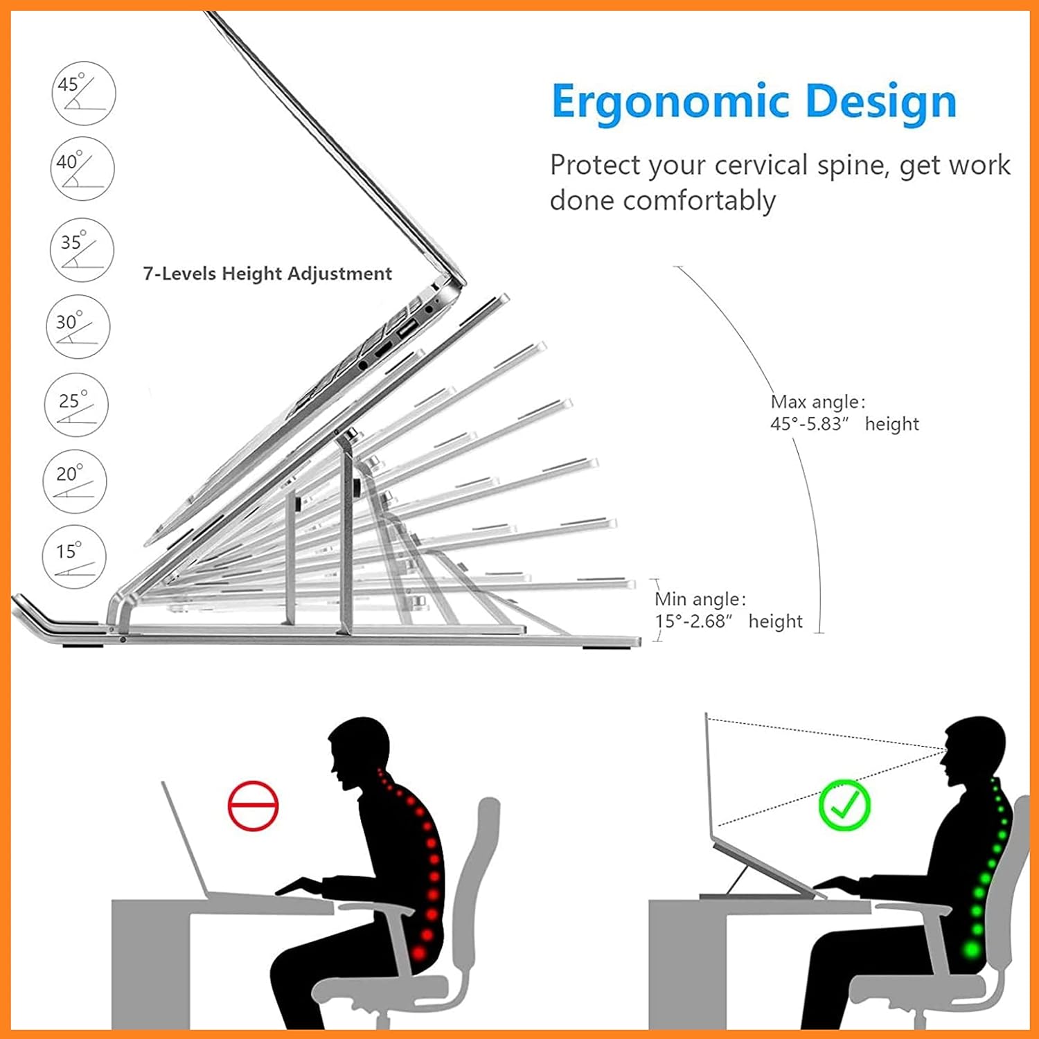 Multi-Angle Adjustable Design: The Aluminium Laptop Stand Or Metal Laptop Stand Or Foldable Laptop Stand Or Better Known As A Aluminum Laptop Stand Provides 7-Speed Adjustable Height, Adjust To Comfortable Operating Angle And Height Based On Your Actual Need. And The Ergonomic Design Makes For Easy Watching And Typing, Relieving Neck, Shoulder And Spinal Pain.