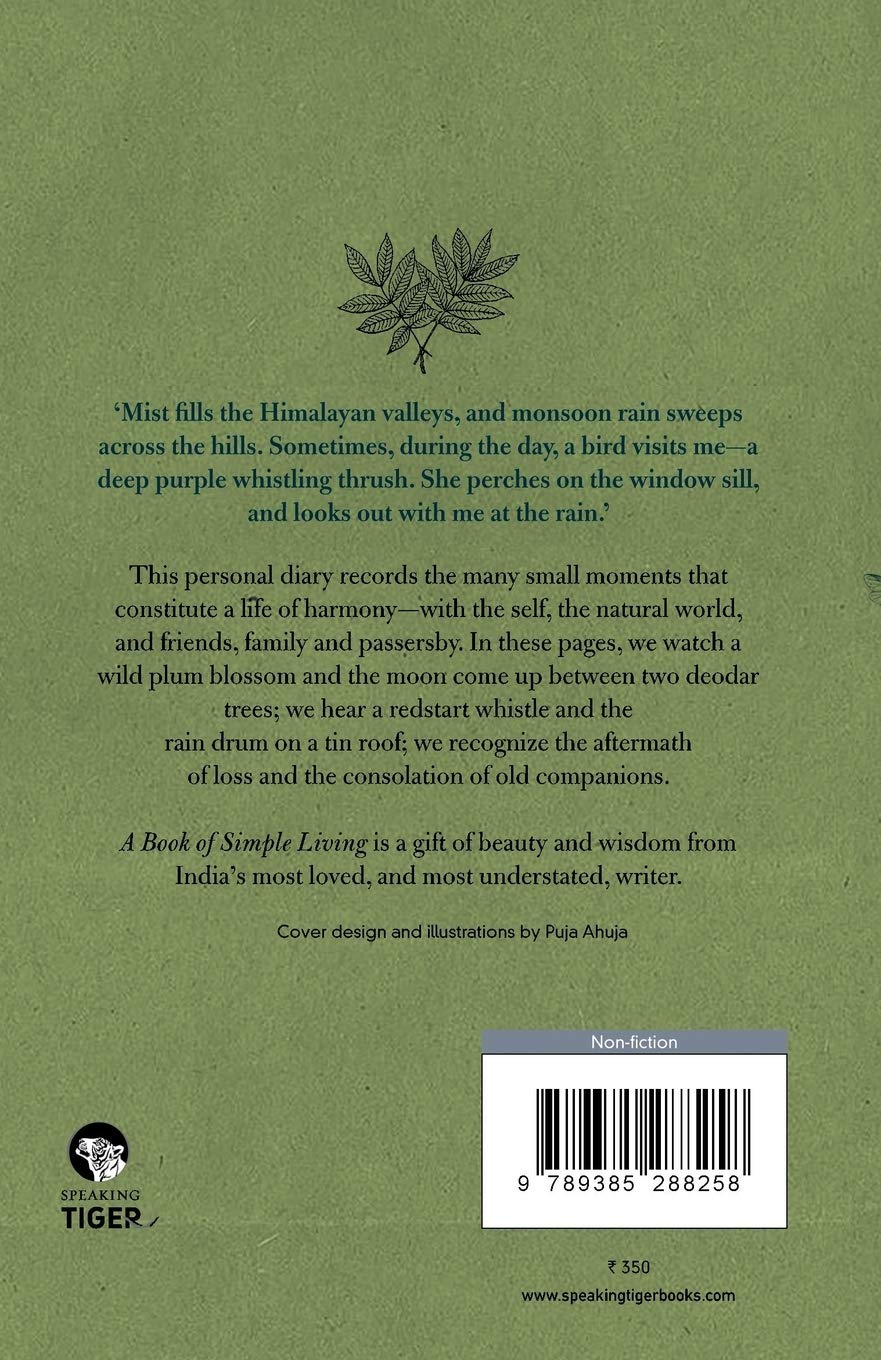 ‘Mist fills the Himalayan valleys, and monsoon rain sweeps across the hills. Sometimes, during the day, a bird visits me-a deep purple whistling thrush. She perches on the window sill, and looks out with me at the rain.’ This personal diary records the many small moments that constitute a life of harmony-with the self, the natural world, and friends, family and passersby. In these pages, we watch a wild plum blossom and the moon come up between two deodar trees; we hear a redstart whistle and the rain drum on a tin roof; we recognize the aftermath of loss and the consolation of old companions. ‘A Book of Simple Living’ is a gift of beauty and wisdom from India’s most loved, and most understated, writer.