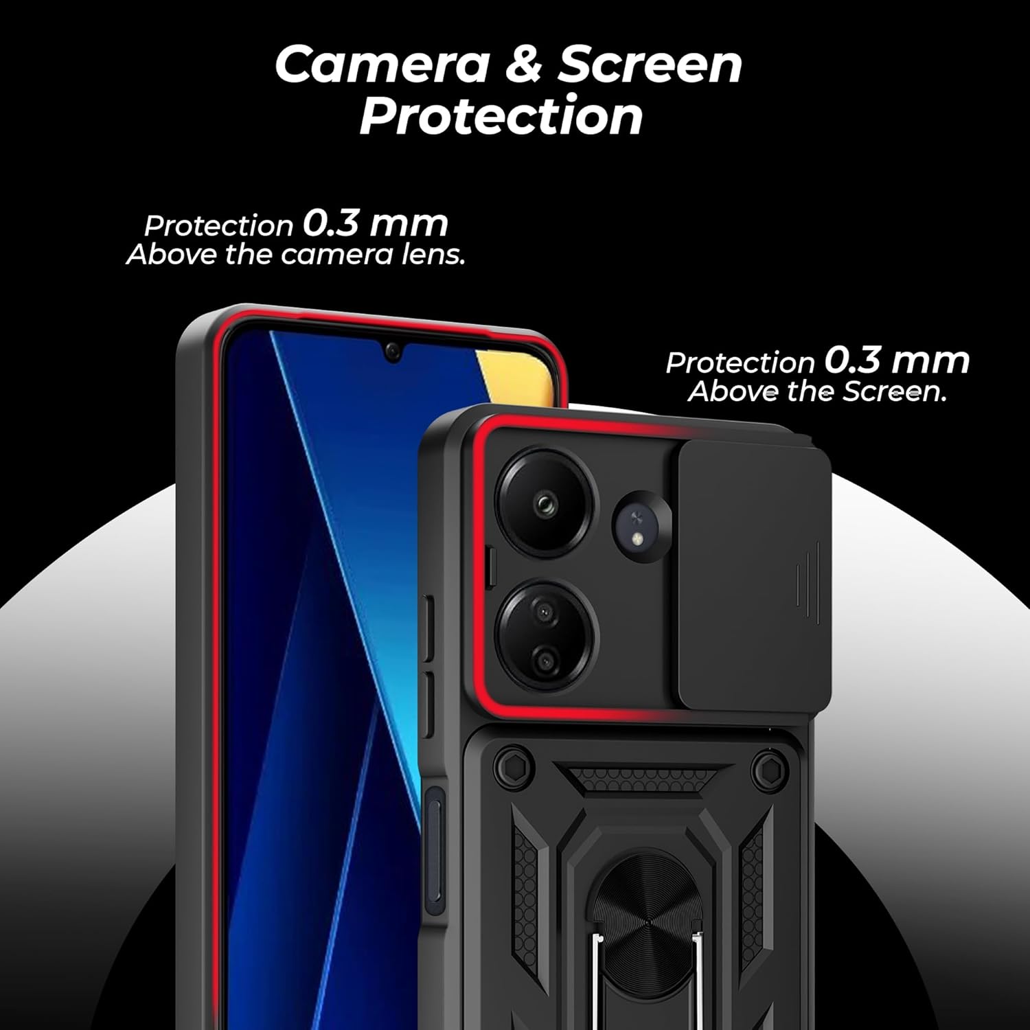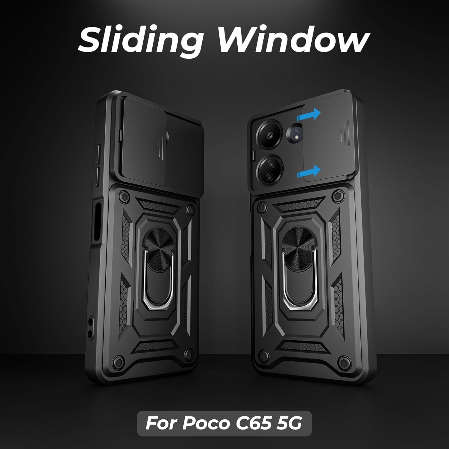 A rtistque Armor Bumper Back Case Cover for Mi Redmi 13C 4G / Poco C65 5G / 13C 5G | Stylish Ring Holder & Inbuilt Stand | Sliding Camera | Shockproof TPU Protective – 13C / Poco C65 Cover – Black