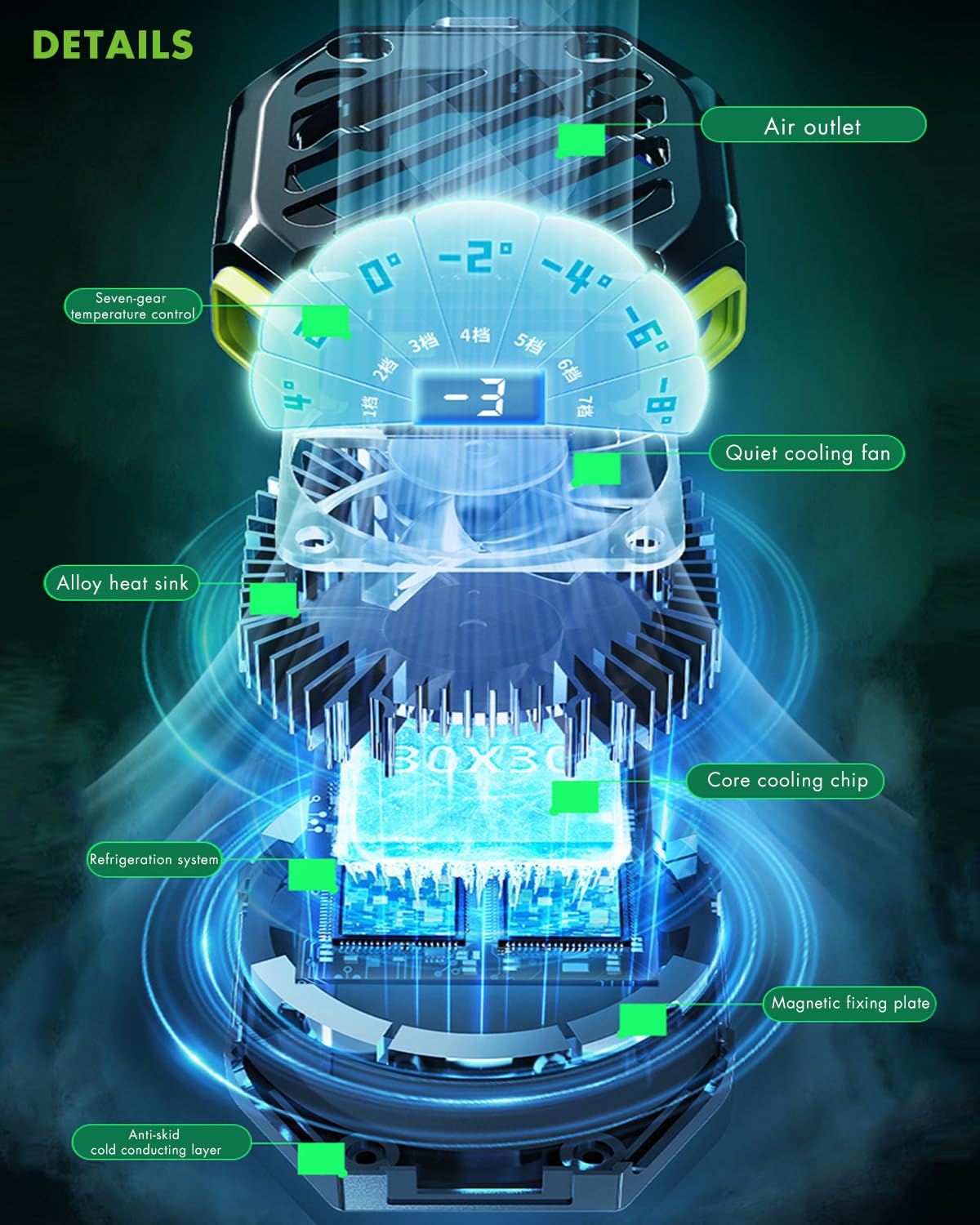 ACEDAYS Magnetic Phone Cooler with Rechargeable Battery,Phone Cooling Fan with RGB LED Semiconductor Cooling, Phone Radiator with Temperature Display for Mobile Gaming,Tiktok Live Streaming(Green)
