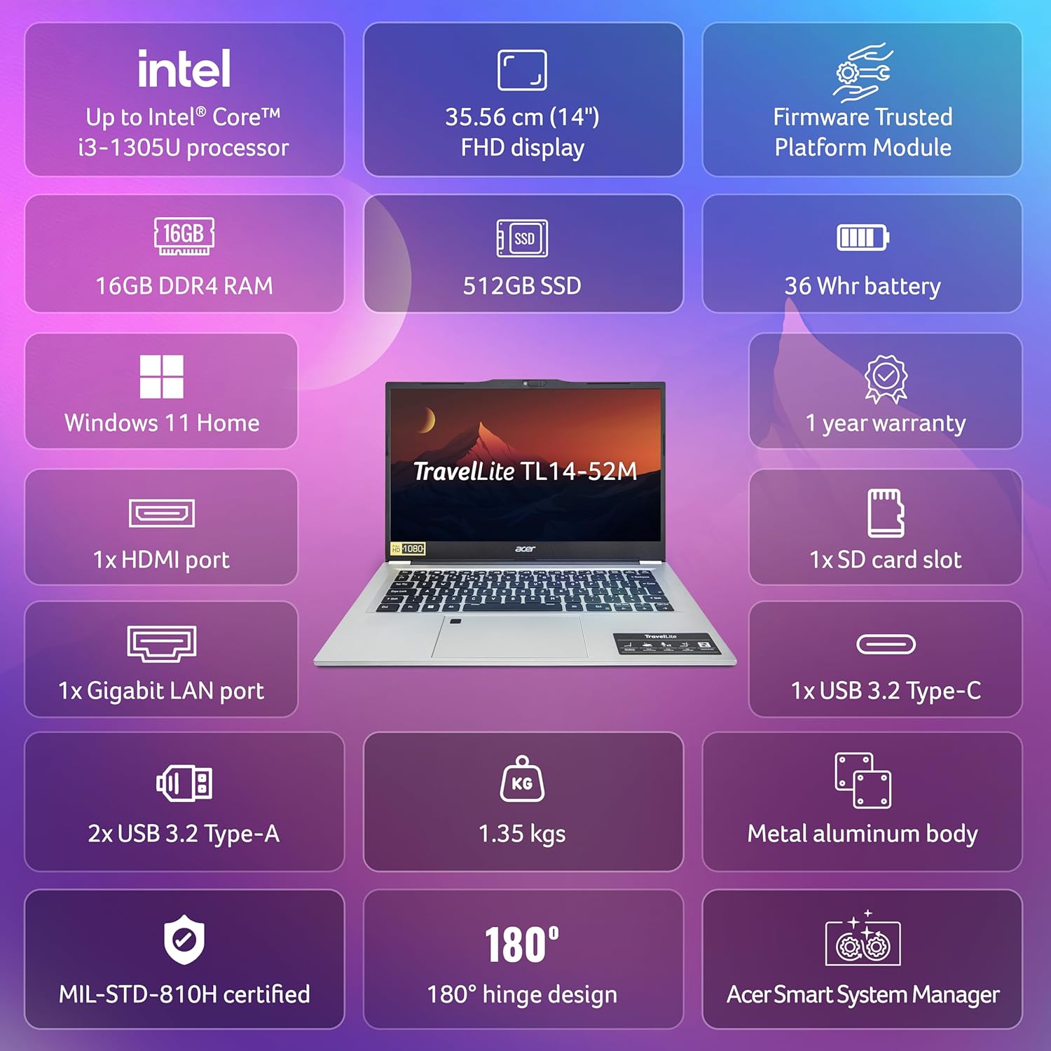 acer TravelLite Business Laptop, 13th Gen, Intel Core i3-1305U Processor (Windows 11 Home/16 GB RAM/512 GB SSD) TL14-52M with 35.5 cm (14″) Full HD Display, 1.34 kg