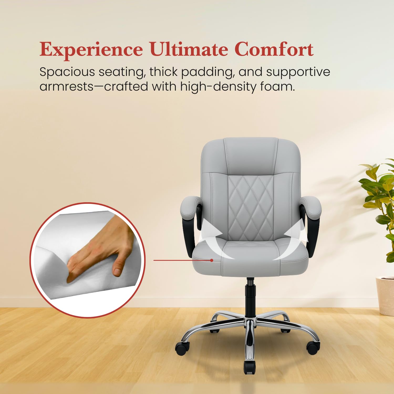 Swivel Functionality – Our ergonomic office chair rotates effortlessly in all directions with its 360-degree swivel function, and the soft leatherette surface is easy to wipe clean—making it both convenient and low maintenance for daily use.