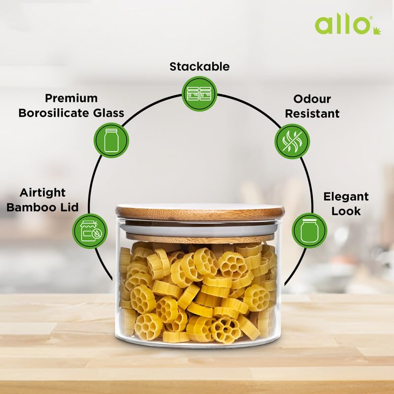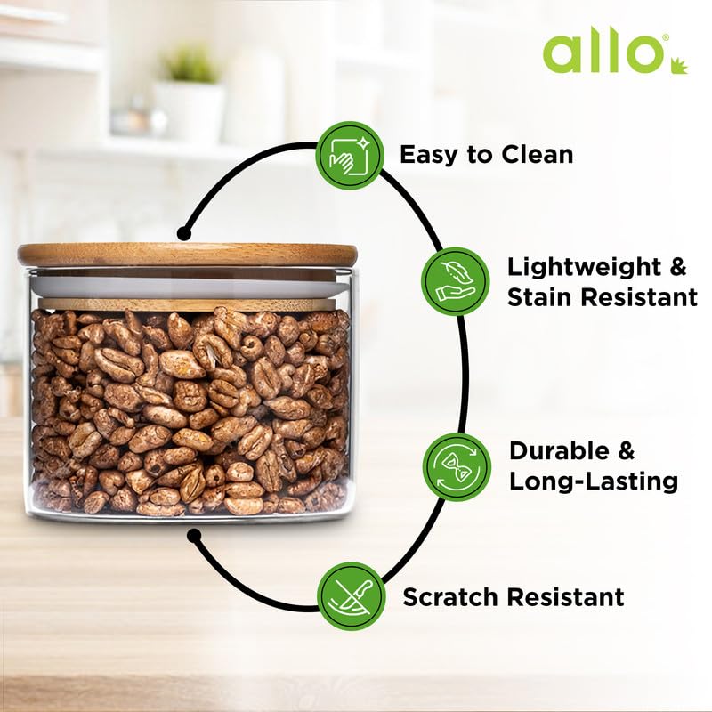 Hi, I am Allo! The purpose of my existence is entirely to provide you with products that are best for your health and you. Each and every product embodies my soul to serve the same purpose. We use more than 20 years of experience in the manufacturing of kitchen products to achieve the purpose of Allo. Welcome to the Allo family, we hope to make every meal a great experience. Introducing Allo Glass Jars with Bamboo Lids, the perfect choice for your kitchen storage needs. These glass jars for kitchen are made from strong borosilicate glass jars, which can handle both hot and cold temperatures without breaking. The glass container with lid features a silicon seal that locks in freshness, making it ideal for storing snacks, pulses, and dry fruits. With their clear design, you can easily see what’s inside without opening the lid. These airtight glass jars are 100% food-safe, ensuring your food stays fresh and free from harmful chemicals. They are easy to clean—simply rinse with water or place them in the dishwasher. Whether you’re looking for a kitchen containers set or a cookie jar, these jars are durable and perfect for everyday use. The sleek and minimalist look of Allo Glass Jars adds a modern touch to your kitchen. Use them as a masala jar, glass spice jars, or a small glass container to keep your space neat and organized. Their stylish design makes them a great addition to any pantry or countertop. These airtight jar set glass options also make a thoughtful gift for housewarmings, birthdays, or anniversaries. Available in different sizes, including the popular glass jar, they are practical and eco-friendly. Choose Allo Glass Jars for a smart, stylish, and sustainable way to store your food while reducing plastic waste. These glass storage jars with lid help you stay organized while keeping your food fresh and safe.