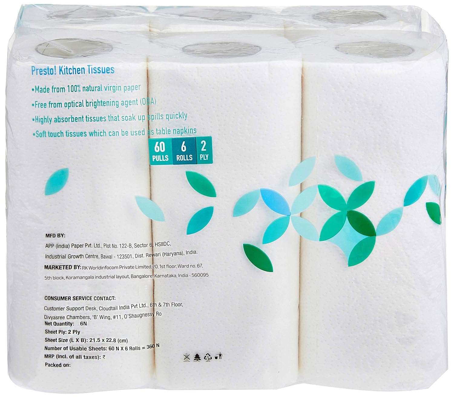 Amazon Brand – Presto! 2 Ply Kitchen Tissue Rolls | 360 Pulls | 60 Kitchen Towels X 6 Rolls | Soft And Highly Absorbent | 100% Natural Virgin Cellulose Fiber
