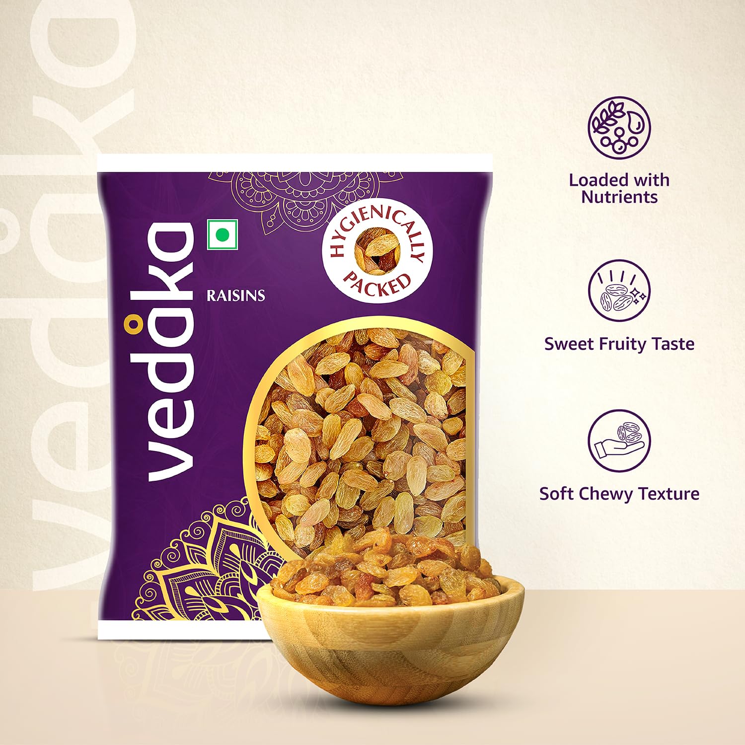 Vedaka brings to you high-quality regular-sized raisins with a sweet fruity taste and a soft chewy textyure. They are packed in a food-safe polybag to keep them safe in the journey to your home. These raisins are packed in an integrated nuts & dried fruits unit and may contain occasional traces of other nuts & dried fruits. May contain an occasional stem/ stalk Store in a cool, dry place in an airtight container and preferably refrigerate after opening.