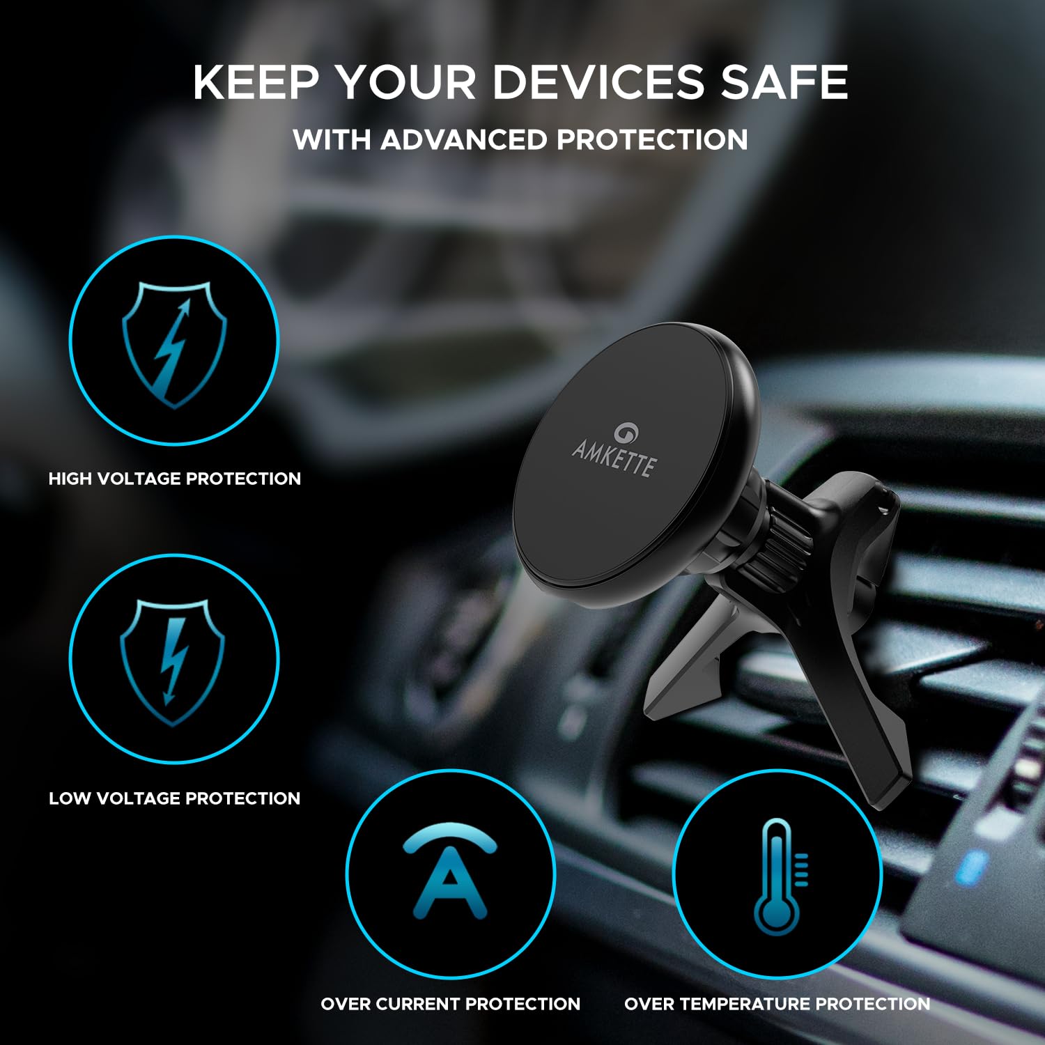 Amkette iGrip Car Wireless Charger with Ultra Stable Air Vent, Hook & Clamp Design, 15W MagSafe Compatible, Magnetic Mobile Holder for Car | MagSafe Ring for Wireless Charging Smartphones