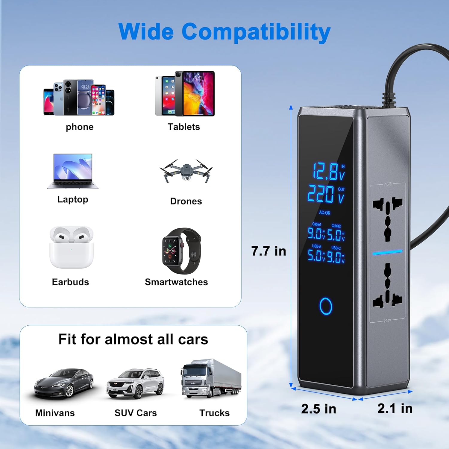 Compatible with most cars, SUVs, and vansWorks with 12V–24V vehicle power systemsCompact design fits securely in car power socket