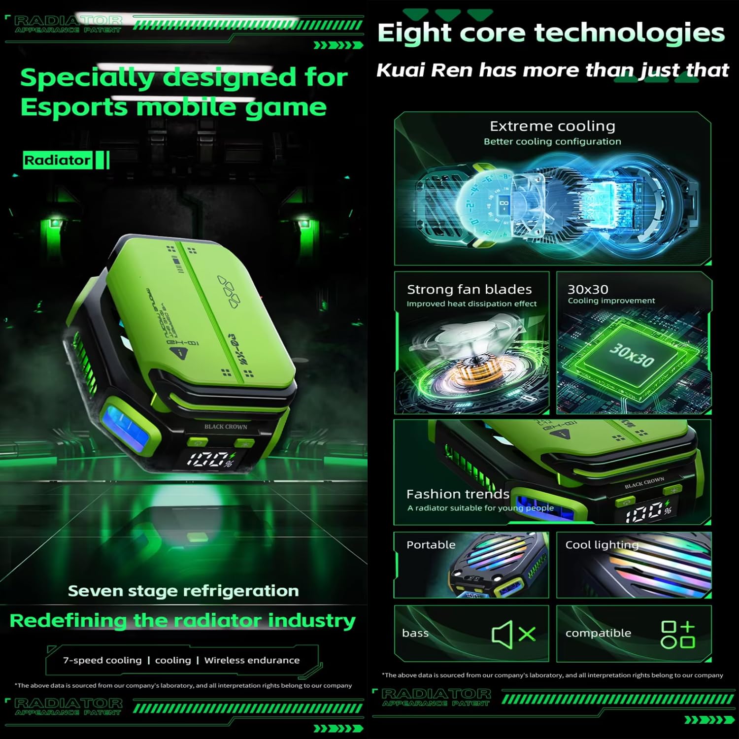 BLACK CROWN X111 Mobile Phone Holder with Removable Battery, Magnetic Semiconductor Cooling External Radiator Portable Magnetic 7-Speed Semiconductor RGB Phone Gaming Refrigeration.(Green)