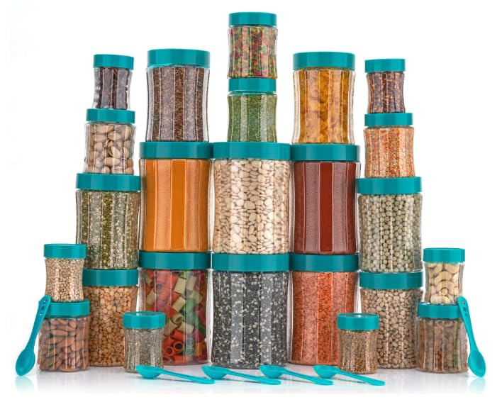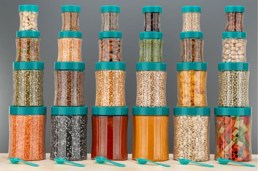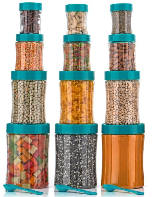 Black Olive Storage Organizer Container Set – Transparent Jar Set for Kitchen with Lids & Spoons, 1200ml, 650ml, 350ml & 250ml Dabba Box for Spices, Snacks, Grocery & Dry Fruits (Green, 16pc)