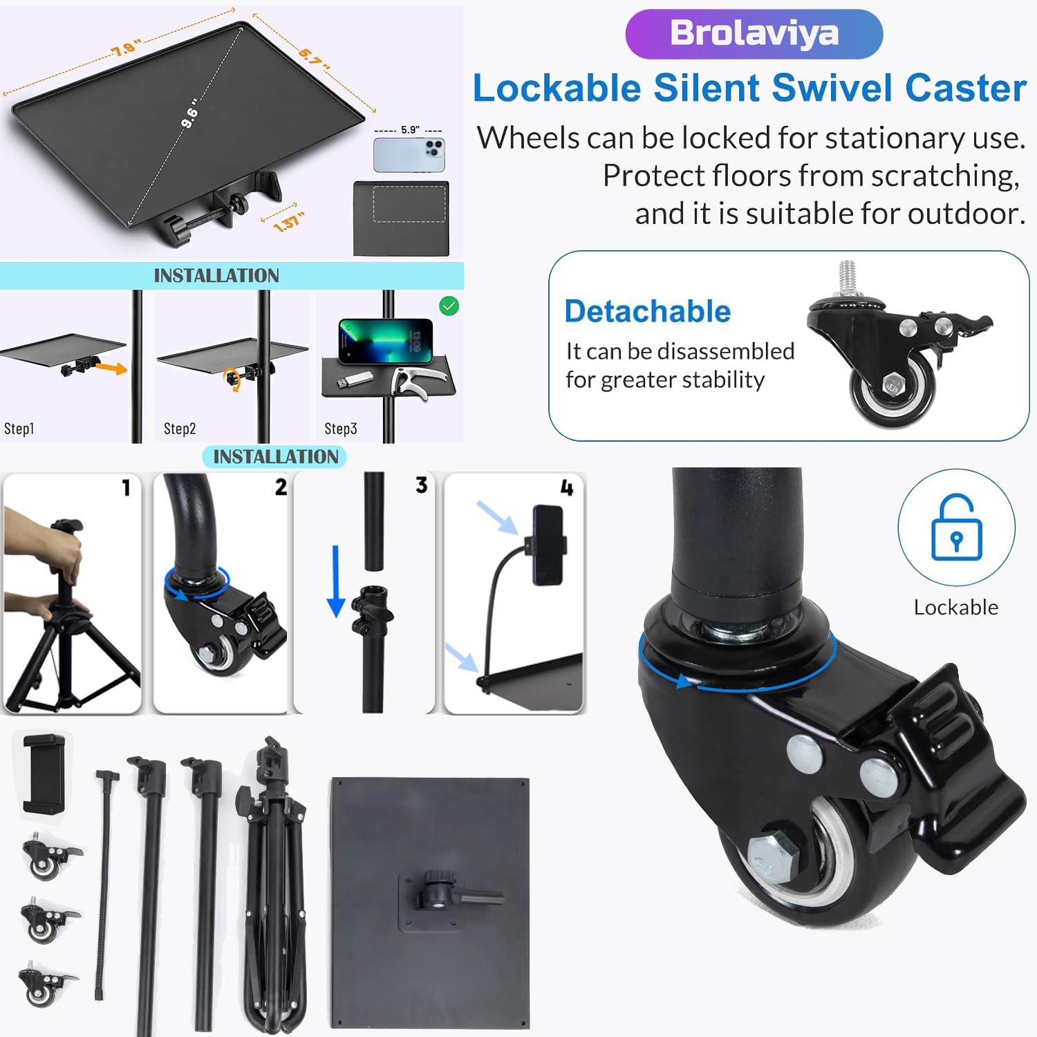 Tripod stand come with adjustable height from 21 to 51 inch to ensure ideal placement and comfortable use. Main tray dimension 14.9×11 inch, Side tray 7.9 x5.7 inch, with 3 wheels and mobile bracket holder with flexible wire
