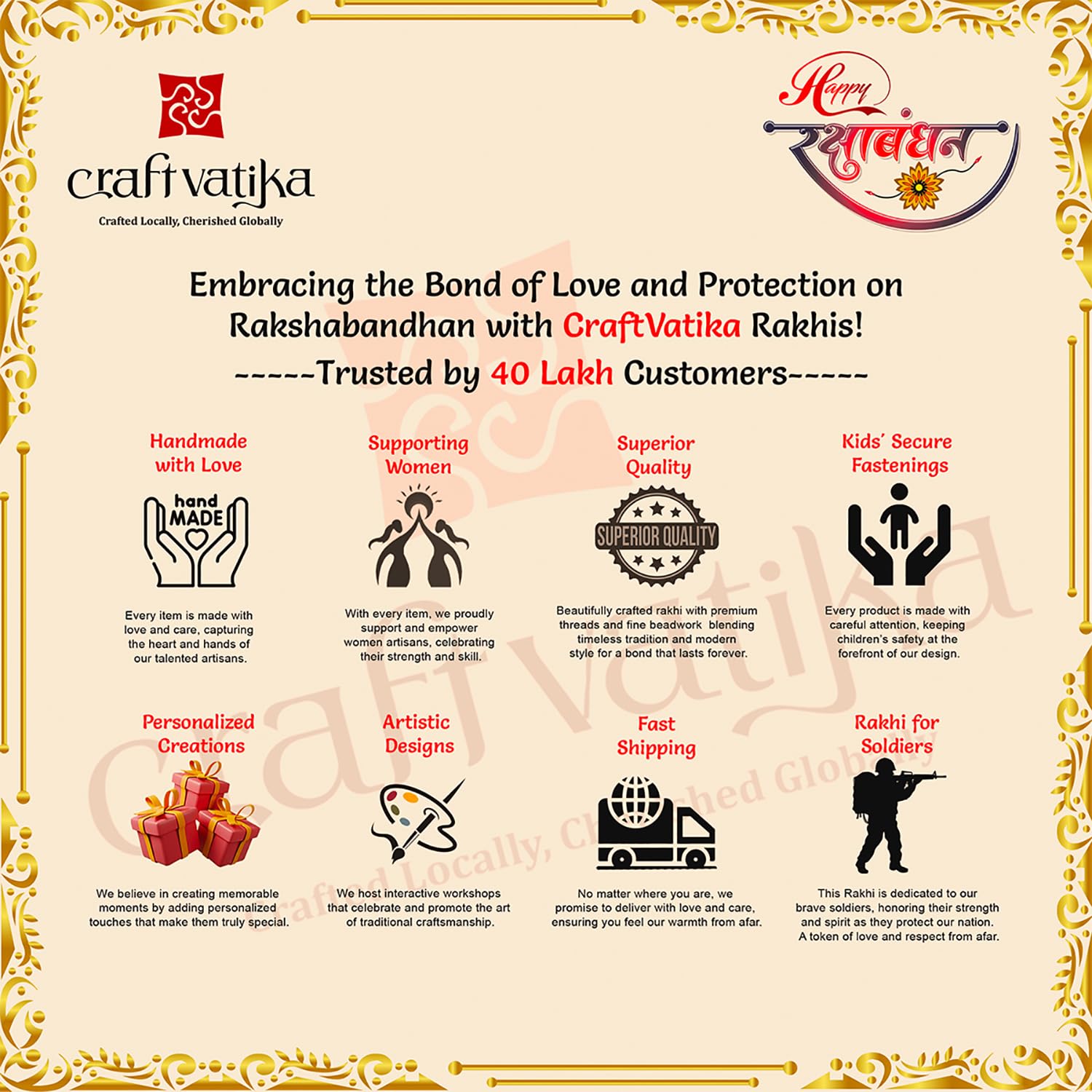 Vocal For Local | Made in India Handmade Rakhis – High Quality Material Used. The designer patterns in the aesthetic style with shimmering glimpse highlights the true beauty of this traditional thread.
