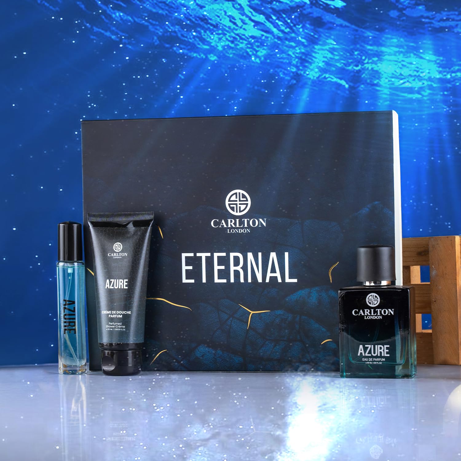 Premium Fragrance Set: Indulge in the luxurious Carlton London Men Gift Set of 3 Azure Perfume, featuring a 50ml eau de parfum, a cream, and a 15ml travel-size perfume.