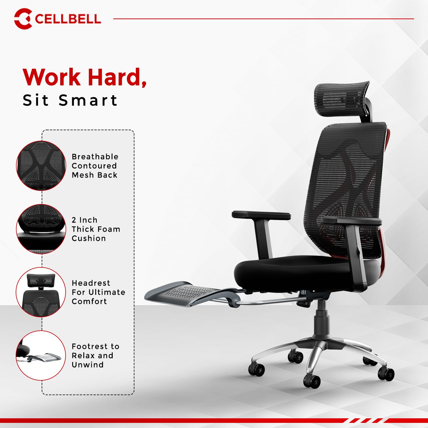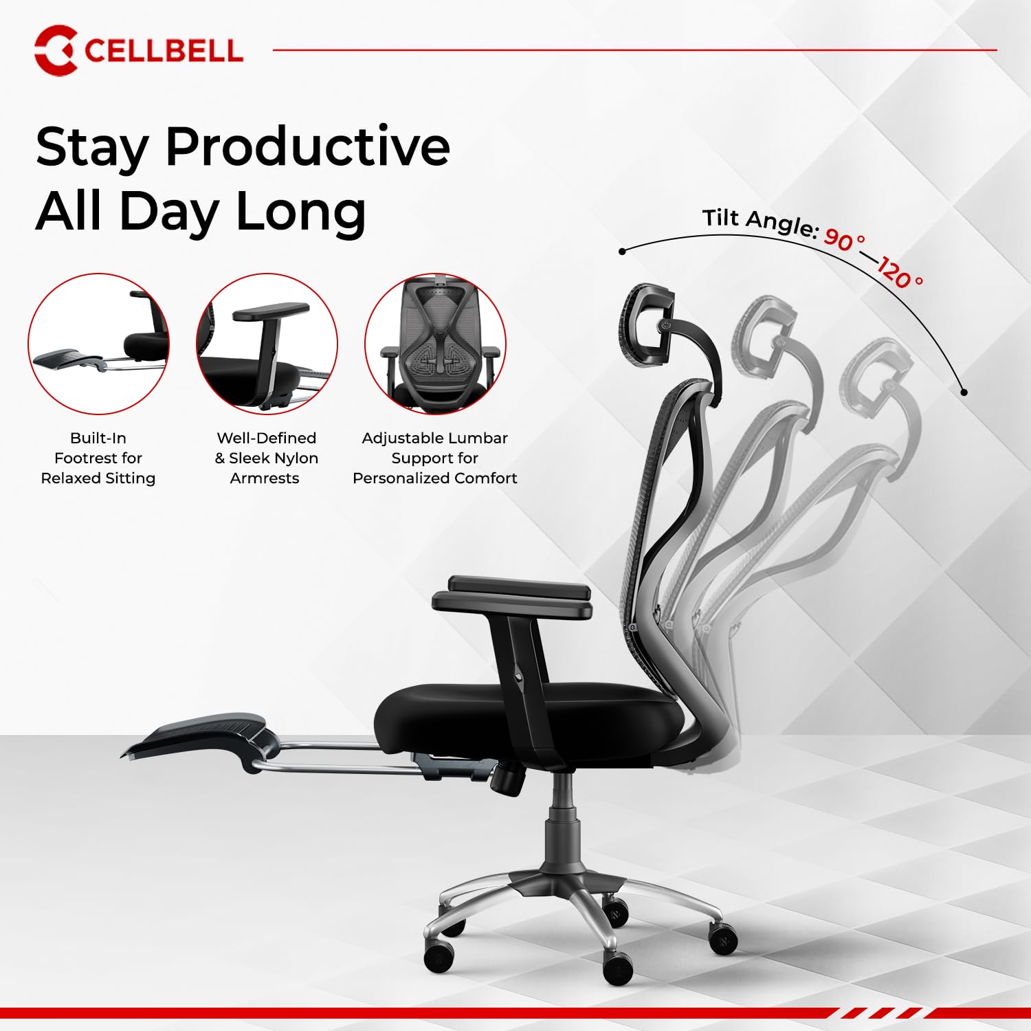 CELLBELL C190 Berlin FT Ergonomic Office Chair with Footrest – High Back Mesh, Adjustable Armrest, Synchro Mechanism, Reclining Computer Chair, 3-Year Limited Brand Warranty (Full Black)