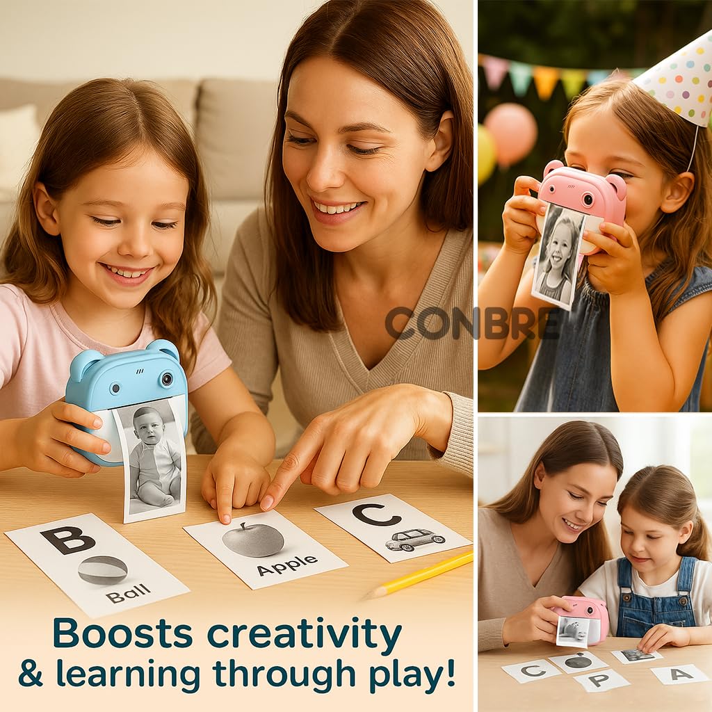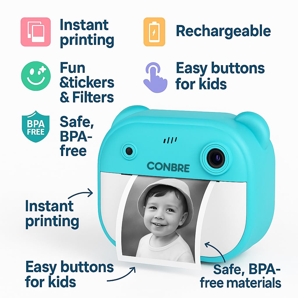 Conbre Kids Instant Print Camera with 4 Games – 3-in-1 Digital Camera for Boys & Girls Ages 3-12 | Print Photos & Record Videos | Supports 64GB SD, Gift-Ready – 2 Rolls (Teddy)