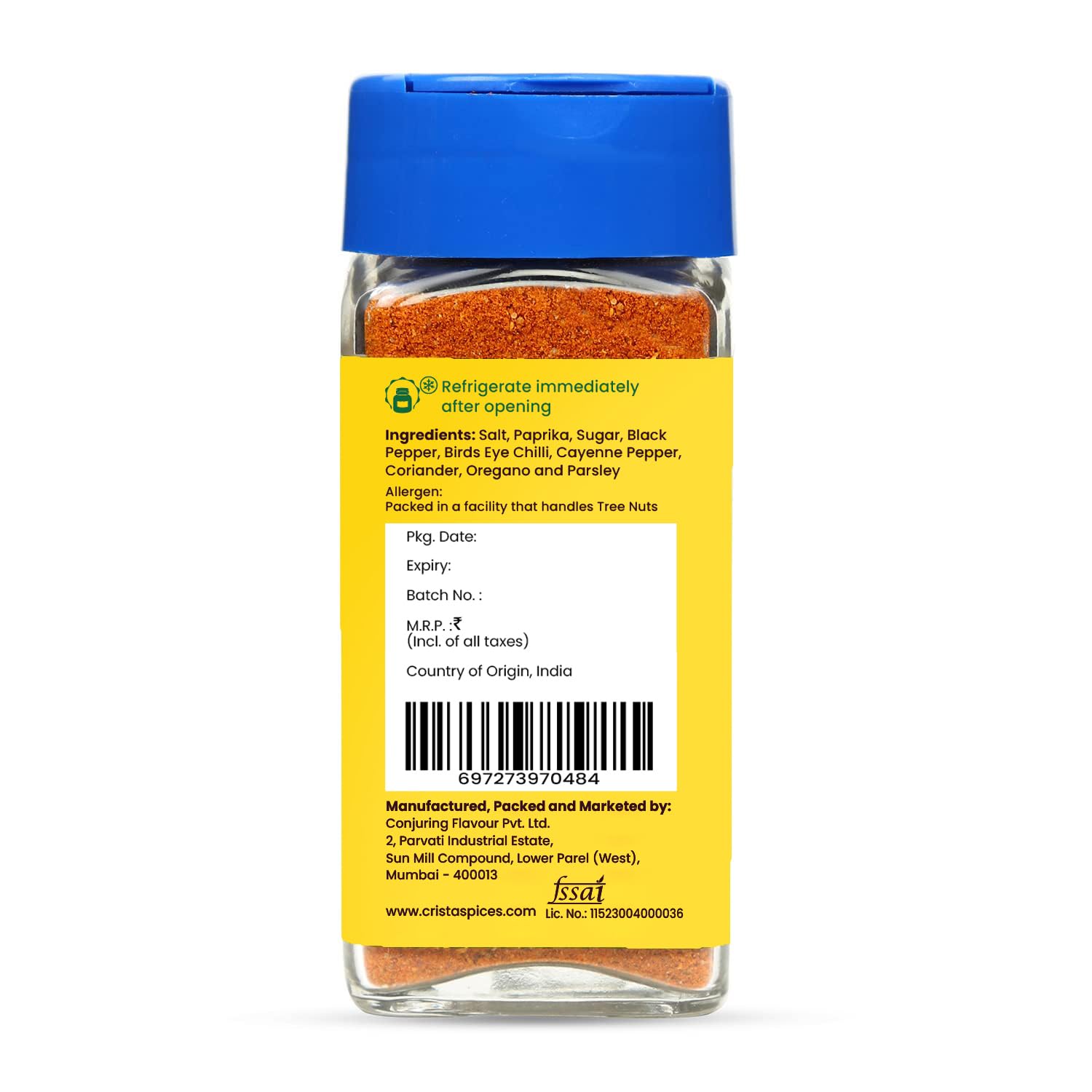 Hey! Its me Jain Tangy Peri-Peri Spice Mix. Team CRISTA’s absolute favourite, this spice blend is inspired by our love for anything tangy, salty, sweet and zingy! Introducing CRISTA Jain Tangy Peri-Peri Spice Mix – the perfect proprietary spice dry blend of coarse, whole and ground premium-grade spices! It pairs perfectly with french fries, burgers. The key in this blend is a progression in flavour without any one flavour profile overwhelming the other. Freshly machine ground using our sophisticated hammer crushers and micro pulverisers, the blend is mixed in an automatic GMP blender to achieve the desired balance and consistency. PS – you have got to try our recipe for Peri-Peri sauce.