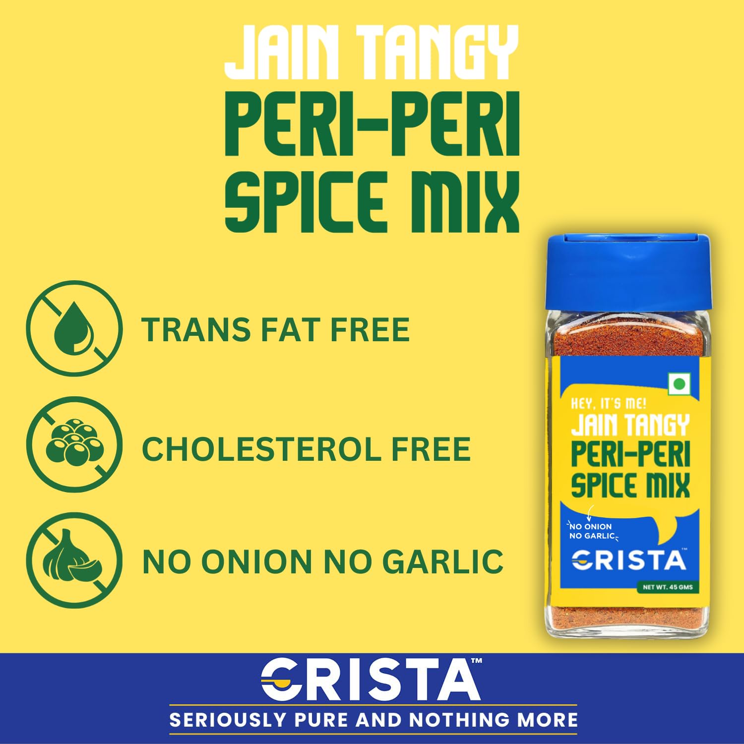 CRISTA Jain Tangy Peri-Peri Spice Mix with No Onion and Garlic, Multi-purpose Seasoning, Trans Fat Free, Vegan Zero added Colours, Fillers, Additives & Preservatives – 45 gms