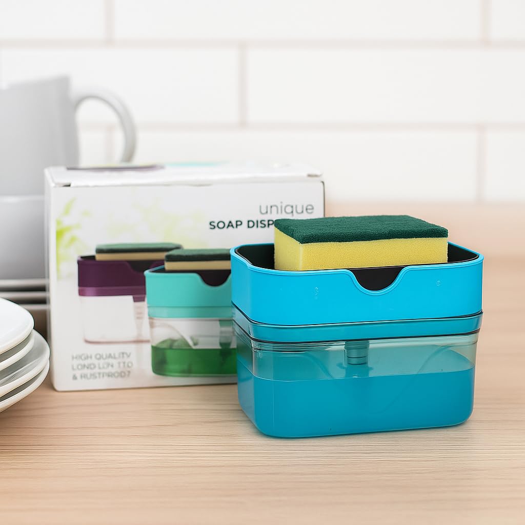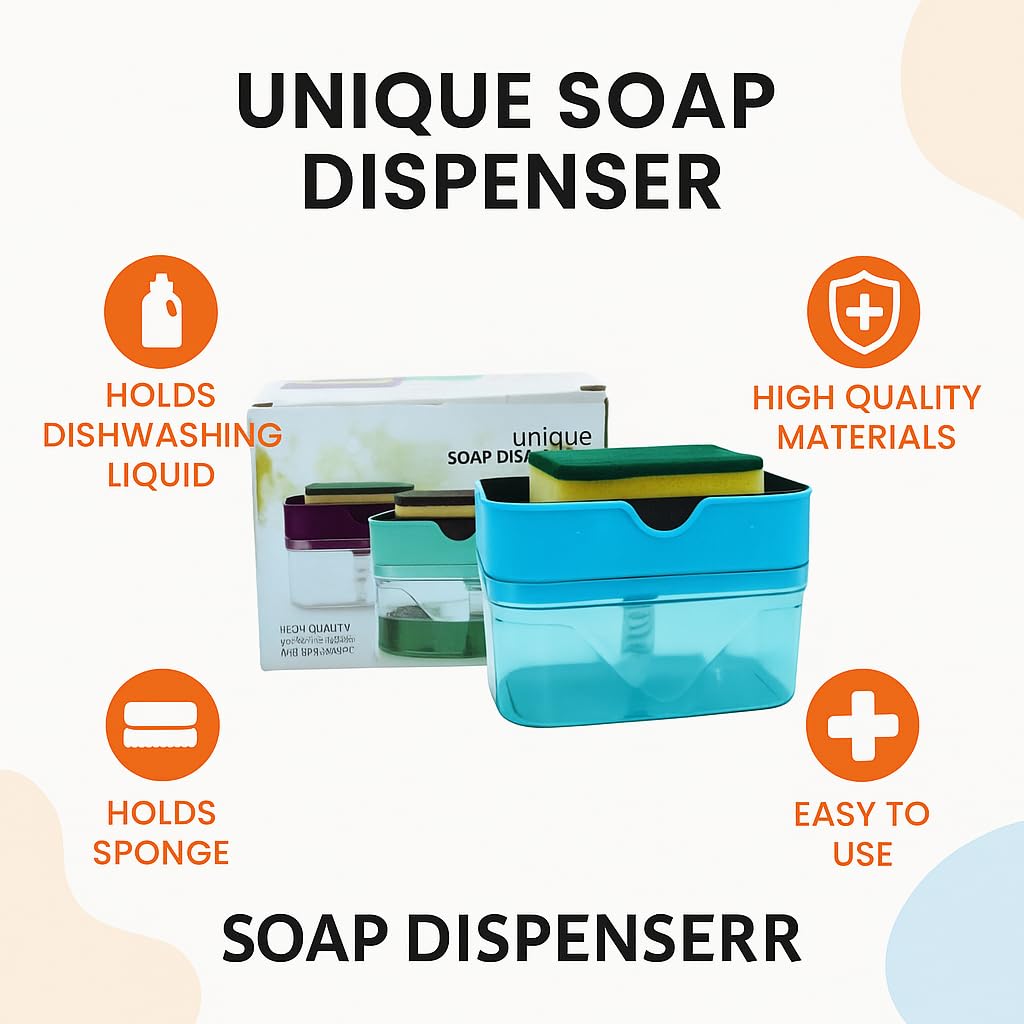 Dish Soap Dispenser with Sponge Holder. This all-in-one soap pump system allows you to dispense just the right amount of dishwashing liquid directly onto your sponge—saving time, reducing mess, and cutting down on soap waste. Designed from high-quality, rust-proof, BPA-free plastic, this compact dispenser features a built-in sponge tray and a responsive pump mechanism. Ideal for busy kitchens and modern homes, it offers convenience, hygiene, and space-saving style in one simple solution.
