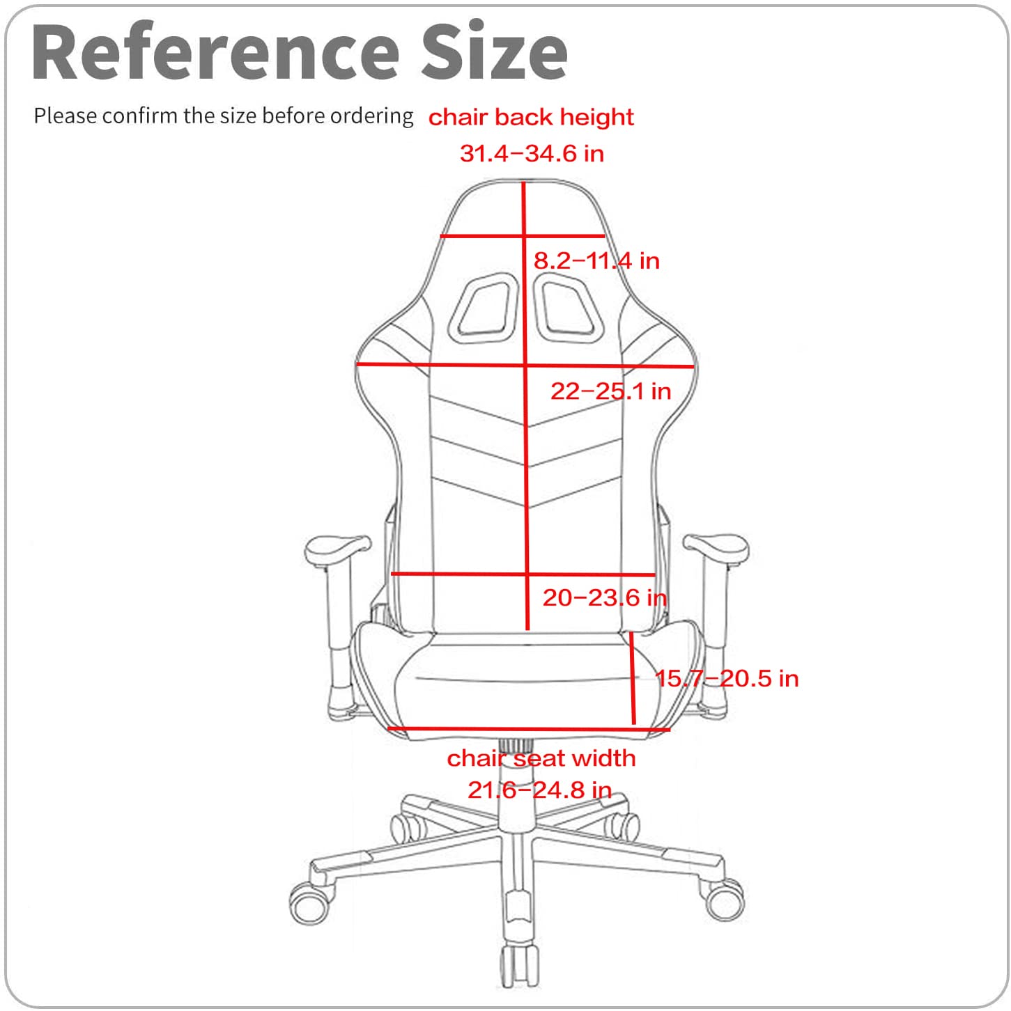 ABOUT SIZE.Suitable for chair size:Back Height: 80-88cm(31.4-34.6inch),Back Top Width: 21-29cm(8.2-11.4inch);Back Middle Width:56-64cm(22-25.1inch);Back Bottom Width:51-60cm(20-23.6inch);Seat Length: 40-52cm(15.7-20.5inch),Seat Width: 55-63cm(21.6-24.8inch);