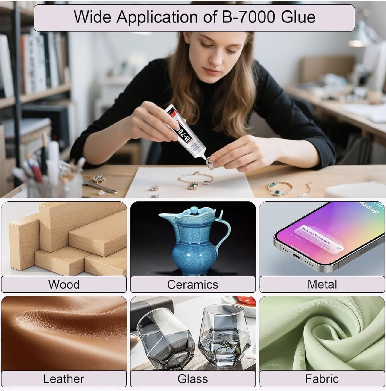 DEXURIES B7000 craft glue can bond a wide range of materials, making it ideal for jewelry making, nail art, phone repair, electronic accessories, toy repair, and general craft work. Suitable for metal, glass, cloth, leather, rubber, fibre, paper, ceramics, wood, textile, nylon, PVC, and more.