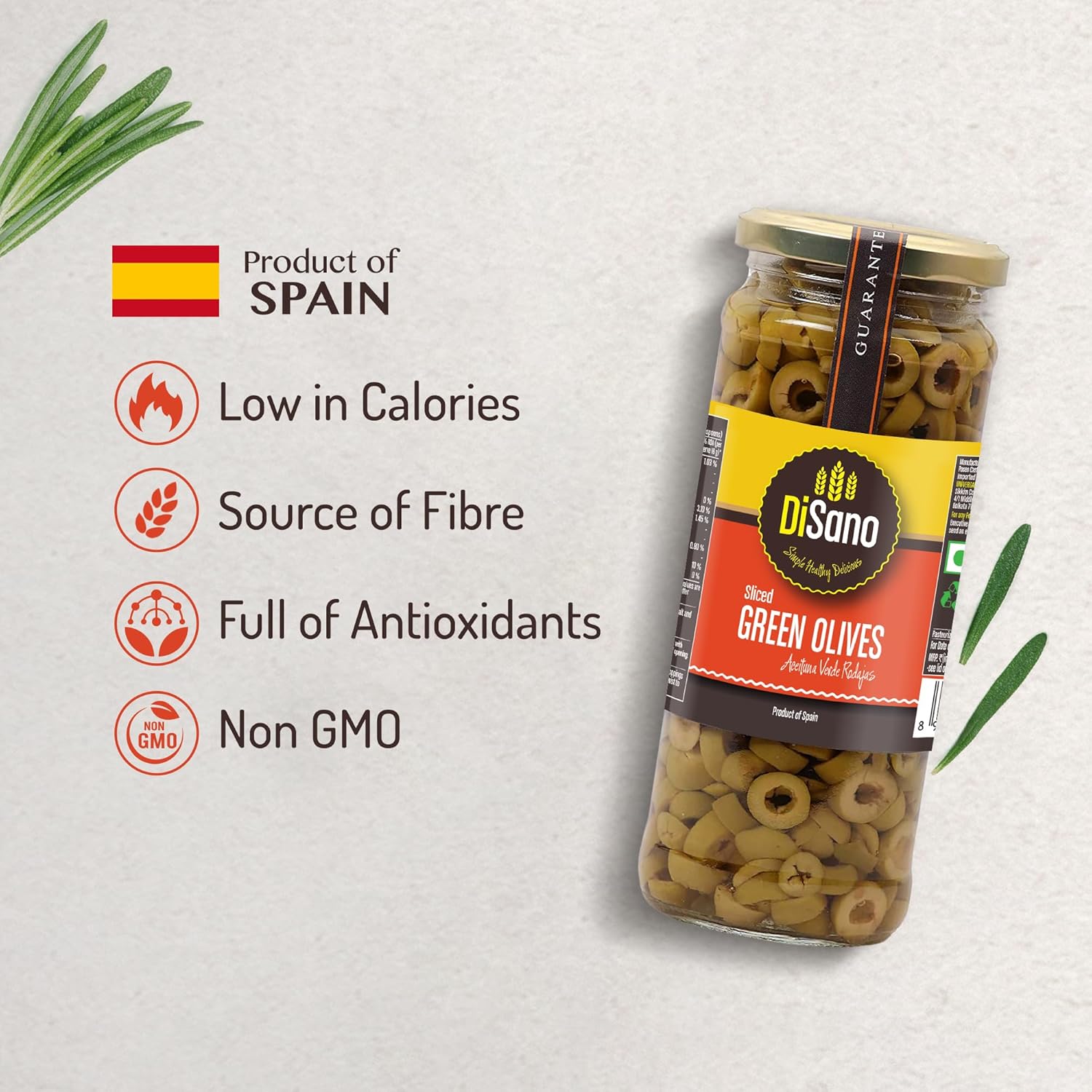 DiSano Sliced green olives are green olives that have been evenly cut olive slices. This preparation makes them easy to incorporate into various dishes, adding flavor and texture.