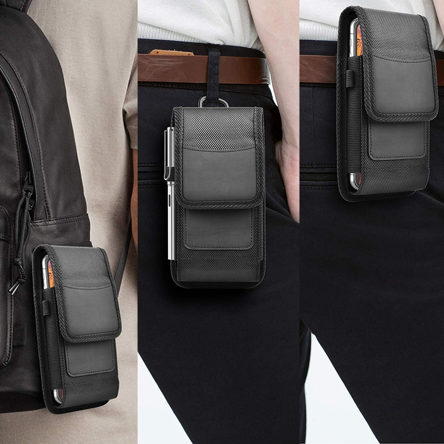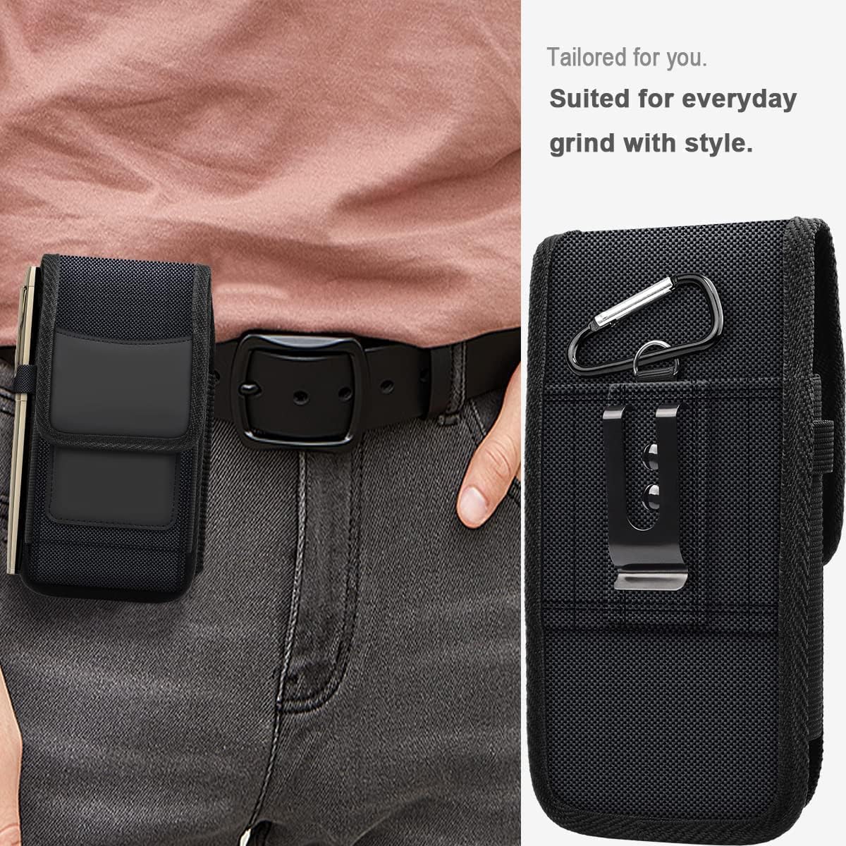 Heavy-Duty Nylon FabricDurability: Resistant to tears, scuffs, and light moisture. It’s far more rugged than leather for outdoor work or harsh environments.Dual Attachment (Clip + Loop)Security: You can use the metal clip for quick “on-off” access, or thread your belt through the reinforced loops for maximum security during high-activity movement.Integrated Card HolderMinimalism: Includes a dedicated slot for credit cards, an ID, or cash, allowing you to leave your bulky wallet at home for short trips.Soft Inner LiningScreen Protection: The interior is usually lined with a microfiber or soft cloth material to prevent scratches on your screen or camera lens.Elastic Side BandsFlexibility: The sides stretch to provide a snug fit, ensuring your phone doesn’t “rattle” inside the pouch even if it’s a slightly smaller model.