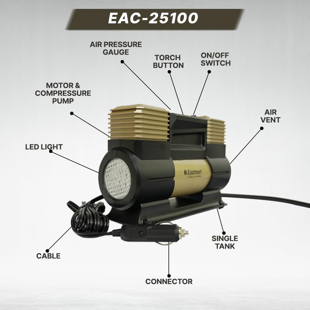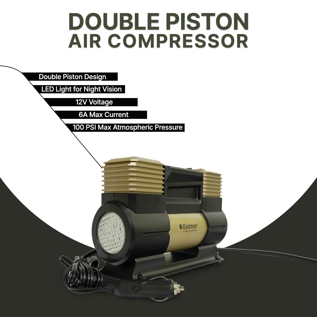 Eastman Heavy Duty Double Piston Car Air Compressor 12V 150 PSI with LED Light 60 L/Min Portable Tyre Inflator Pump for Car Bike SUV (EAC-60150)
