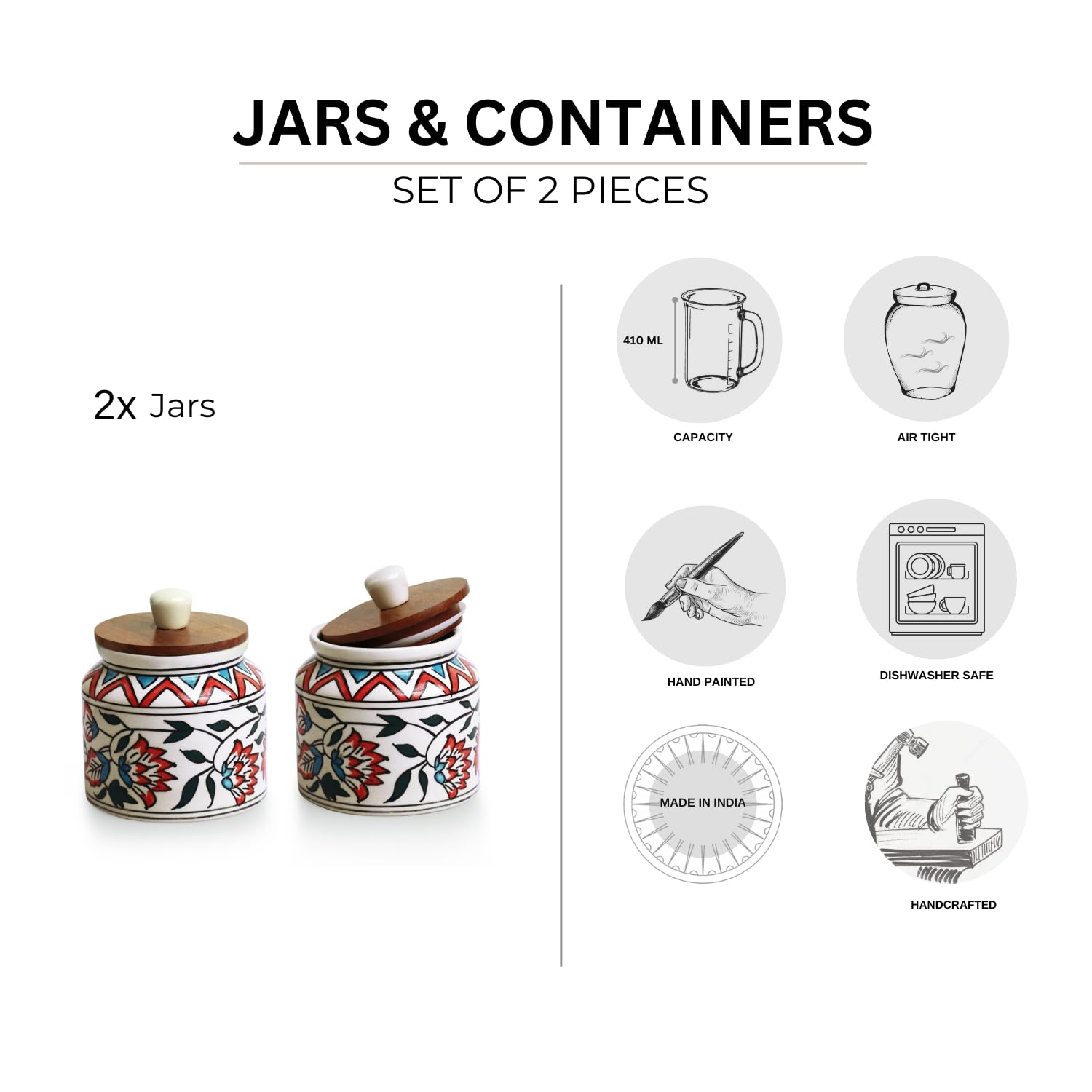 PACKAGE CONTENT: 2 Jars With Lids, COLOR: JAR: White With Multicoloured Hand-Painting, LID: Brown, MATERIAL: JAR: Ceramic, LID: Ceramic & Sheesham Wood.