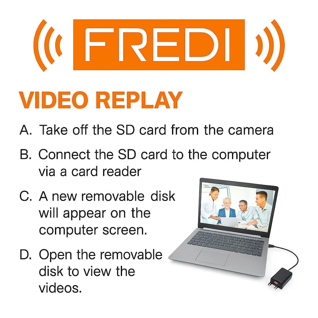 This image demonstrates the simple process of viewing recorded videos from the FREDI HD Plus USB Charger Camera on a personal computer or laptop. Recorded footage can be accessed by removing the memory card from the camera and connecting it to a PC using a compatible card reader. The image highlights direct file access without the need for additional software installation.