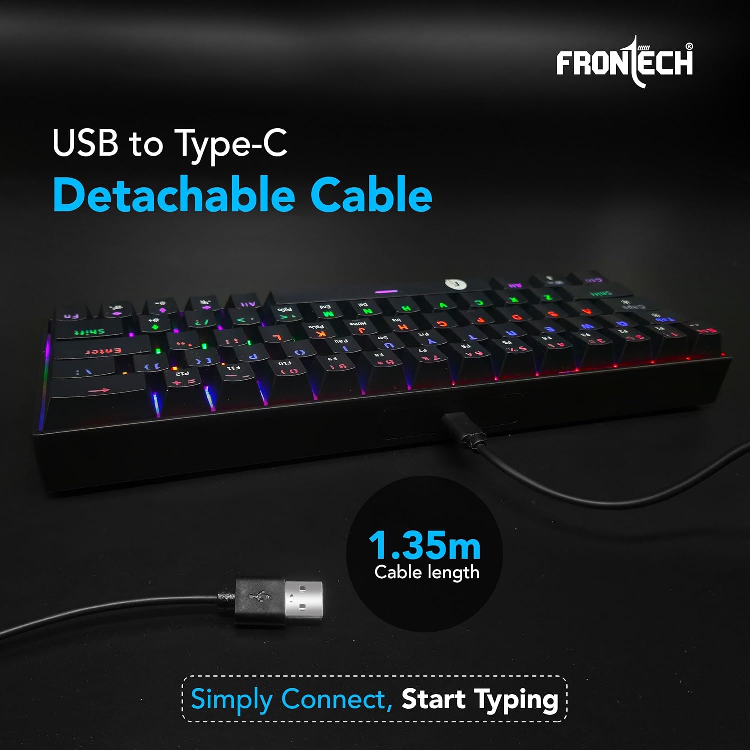 FRONTECH 63-Key Mechanical Gaming Wired Keyboard | Rainbow Backlit | 26 Anti-Ghosting Keys | Detachable Type-C Cable | Compatible with Windows/Mac/iOS/Android (KB-0010P)