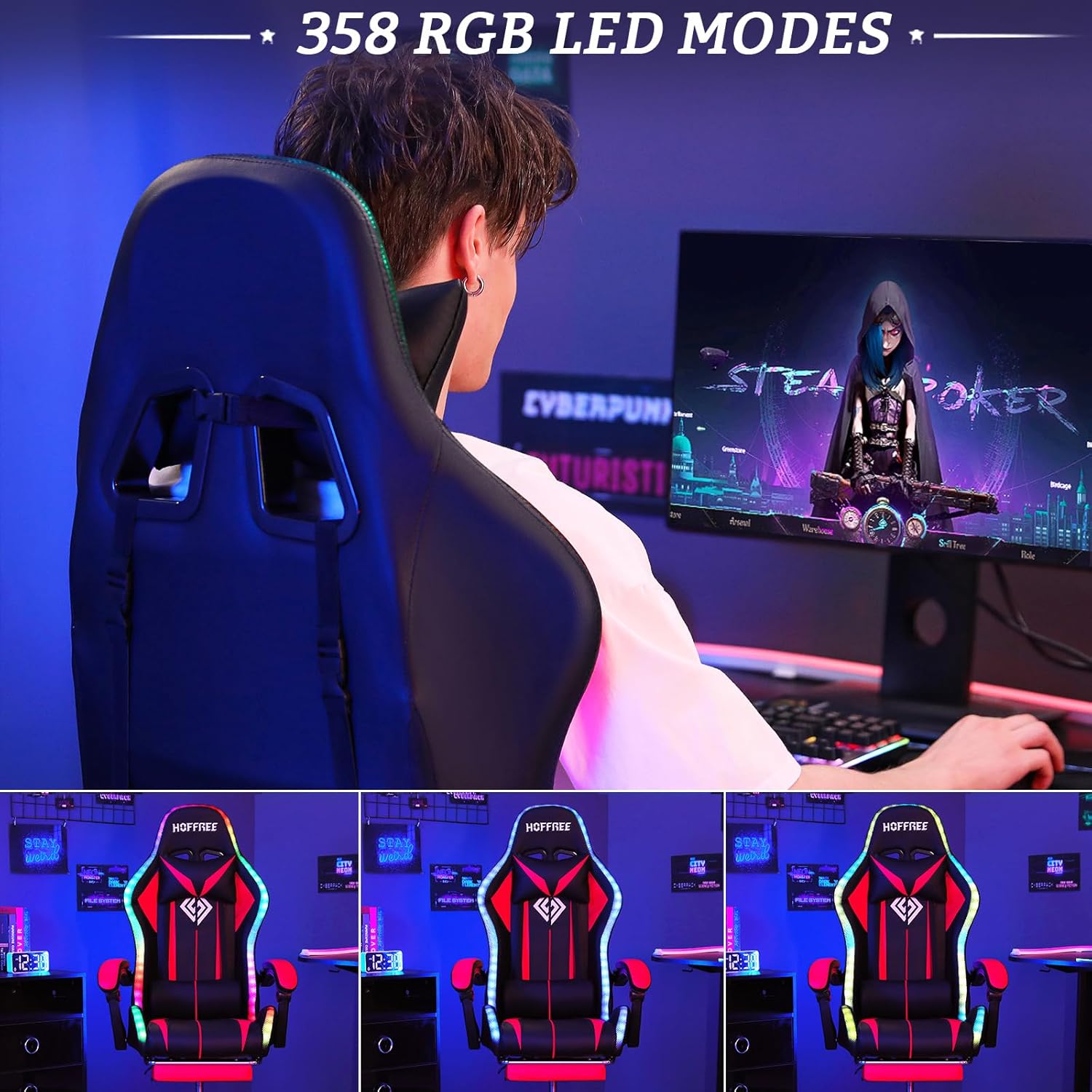 【Colorful RGB LED Lights】Designed with LED flashing lights on the back and the edge of the seat, you can easily adjust multiple lighting modes and brightness, creating a more dynamic feel in your gaming room while playing