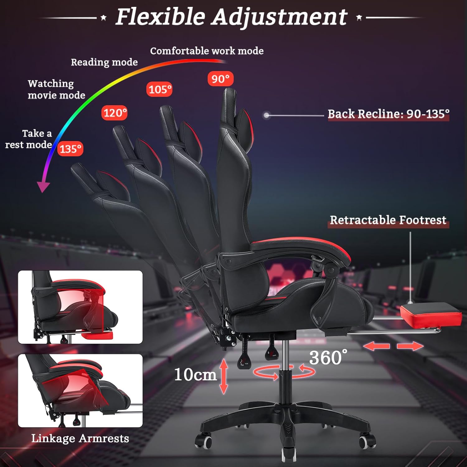 【Adjustable Computer Chair】Well-padded seats, lumbar & headrest cushions make extended gaming sessions more comfortable and enjoyable. The extra bonus footrest and adjustable linkage armrest allows you to enjoy a high-quality nap anytime anywhere, and immediately restore energy