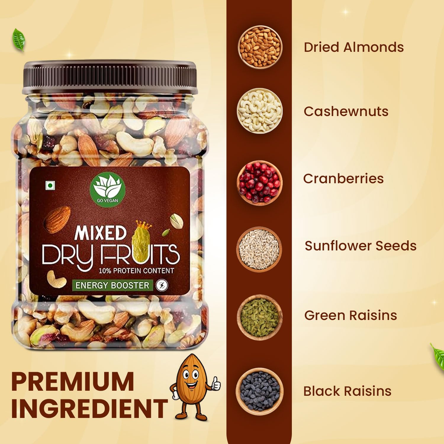 Go Vegan Healthy Nutmix 500gm, Dried Almonds, Black Raisins, Cashewnuts, Cranberries, Black Dates & Many More. (Jar Pack)