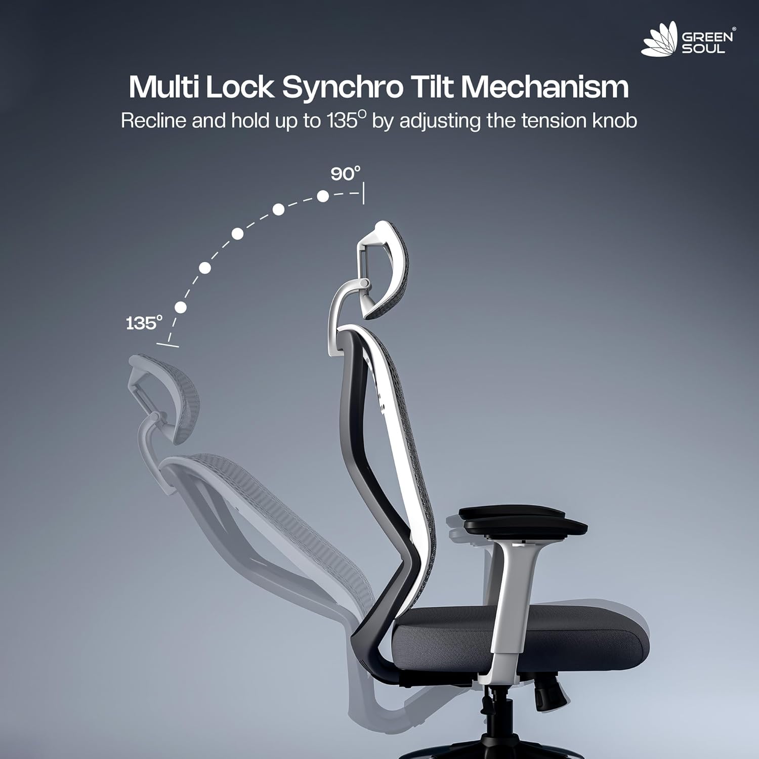 𝗠𝘂𝗹𝘁𝗶-𝗟𝗼𝗰𝗸 𝗦𝘆𝗻𝗰𝗵𝗿𝗼 𝗧𝗶𝗹𝘁 𝗠𝗲𝗰𝗵𝗮𝗻𝗶𝘀𝗺: Allows the chair’s backrest and seat to tilt and recline upto 135° in a synchronized ratio of 2:1, designed to mimic the body’s natural lean-back movement. Just adjust the tension for free movement and lock at the desired recline angle.