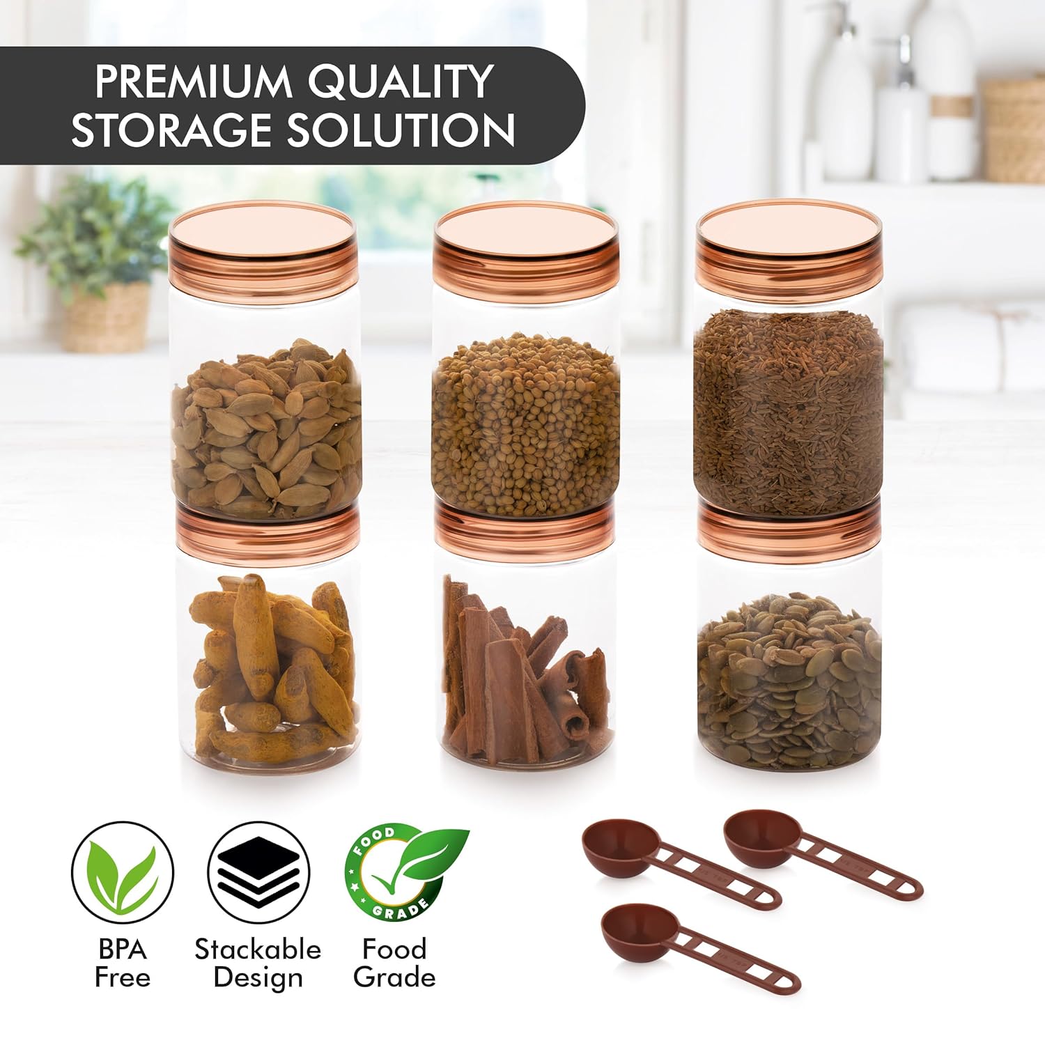 Homeor Plastic Storage Jar & Containers With Spoon, Airtight & BPA Free Containers for Kitchen Storage, Grocery Kitchen Container, Multipurpose Jar, Fridge Storage Container, 500 ML Set 6, Brown