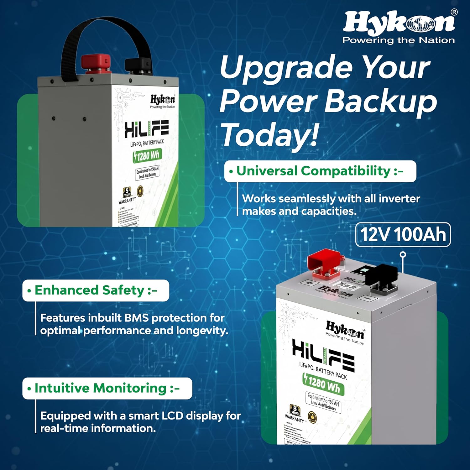 Hykon HiLIFE 12Volt 100Ah Lithium Ferro Phosphate Inverter Battery, Great Backup, BMS protection, Long Life up to 12 years, Works with any Inverter, 5 Years Warranty