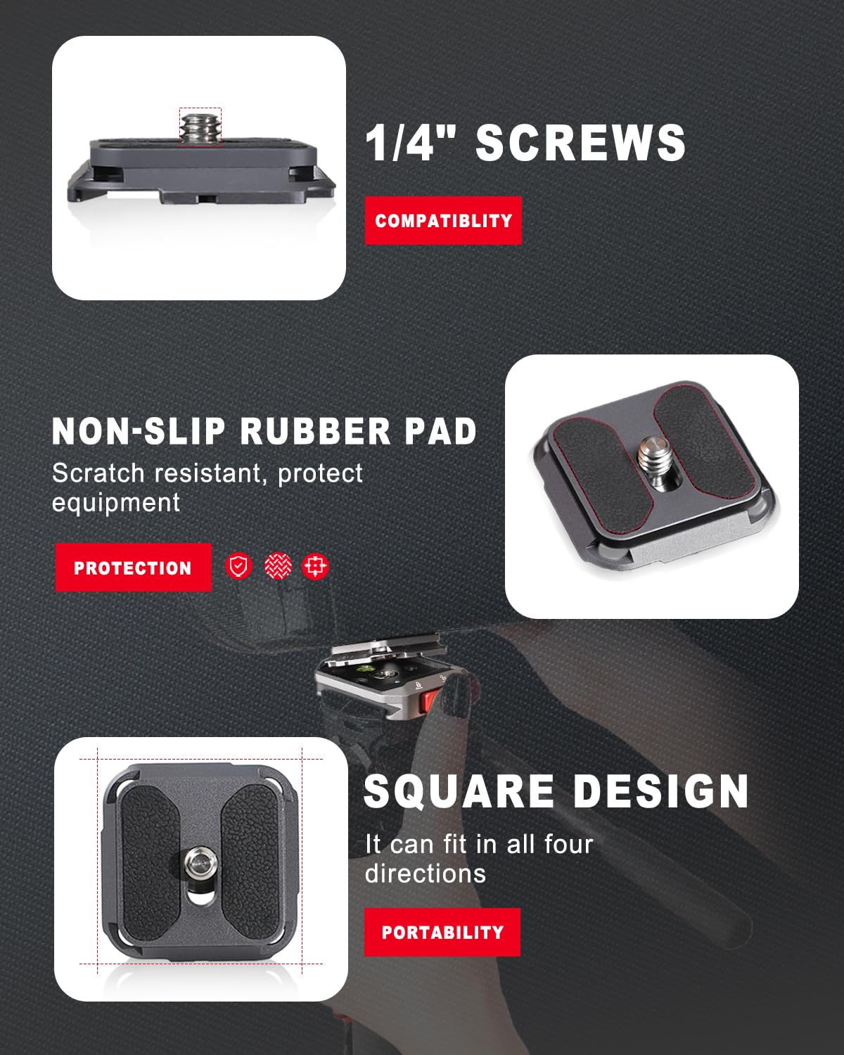 【Camera Protection & Ease of Use】The quick release plate is equipped with raised anti-slip rubber pads that not only protect your camera from scratches but also ensure a secure grip.Additionally, the integrated bubble level on the base helps you adjust to the perfect shooting angle effortlessly.