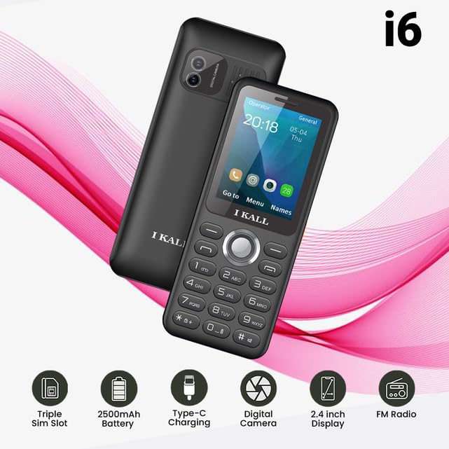 IKALL I6 Feature Keypad Mobile Phone – 2.4″ Screen, 2500mAh Battery, FM Radio, Music & Video Player, Type-C Charging, Triple-Sim (Raven Black)