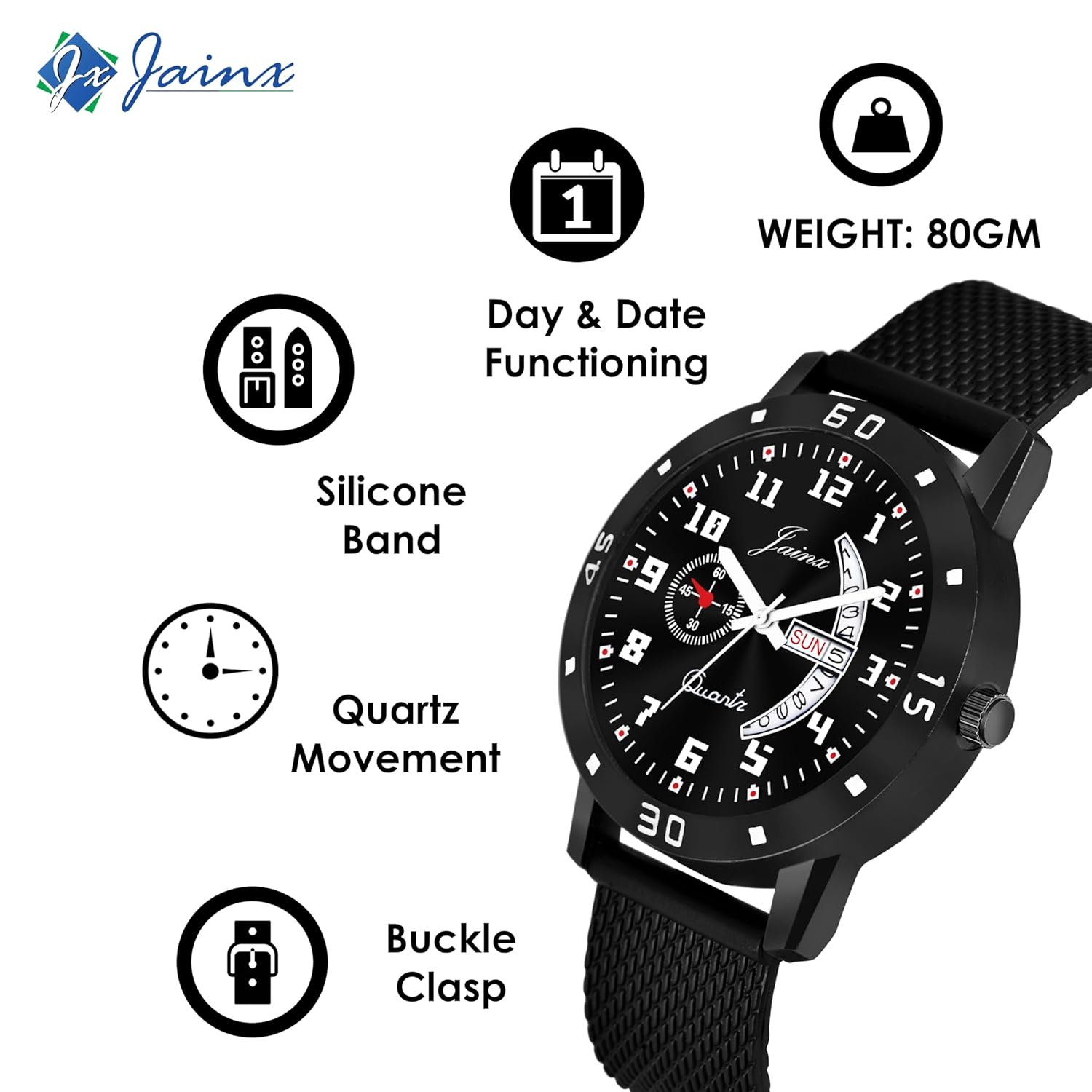 jainx Silicone Strap Black Day and Date Feature Analog Wrist Watch for Men & Boys – JM396