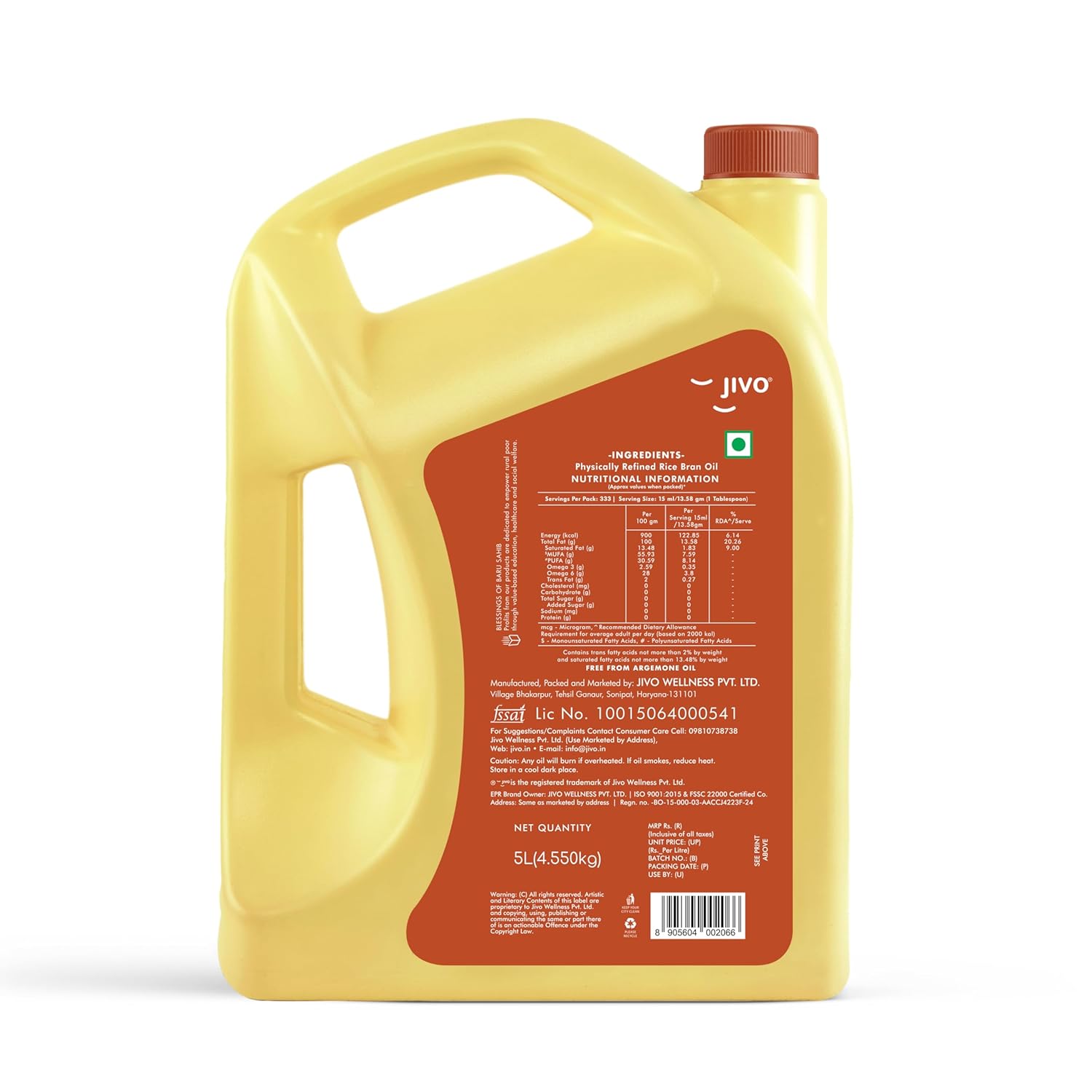 Jivo Rice Bran Oil 5 Litre | Premium Cooking Oil | Rich in Antioxidants | Ideal for Deep Frying, Sauteing & Baking | Chemical-Free