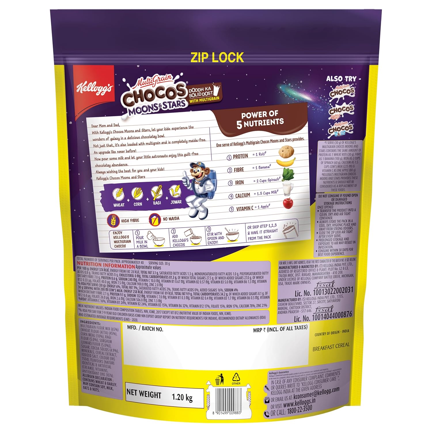 Kellogg’s Chocos Moons & Stars has the goodness of Whole Grain & is source of Fibre. It is high in Calcium & Protein that is essential for your child’s growing body.