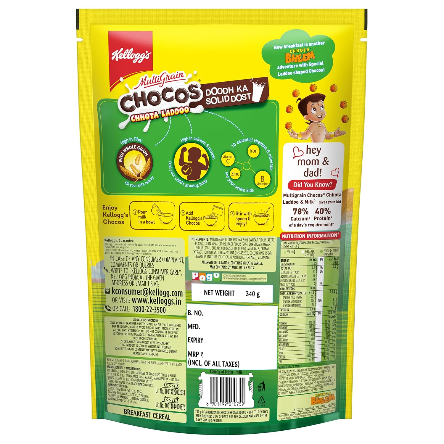 Kellogg’s Chocos Chhota Laddoo has the goodness of Whole Grain & is source of Fibre. It is high in Calcium & Protein to help fuel your child’s growing body.