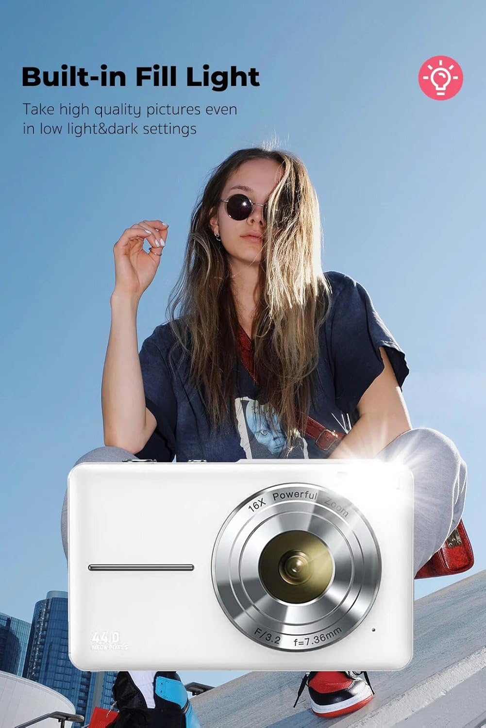 Kids Digital Camera 1080p Batteries Lanyard 16X Zoom Anti Shake 44Mp Compact Portable Small Point and Shoot Digital Camera for Children Teens Girl Boy(White)