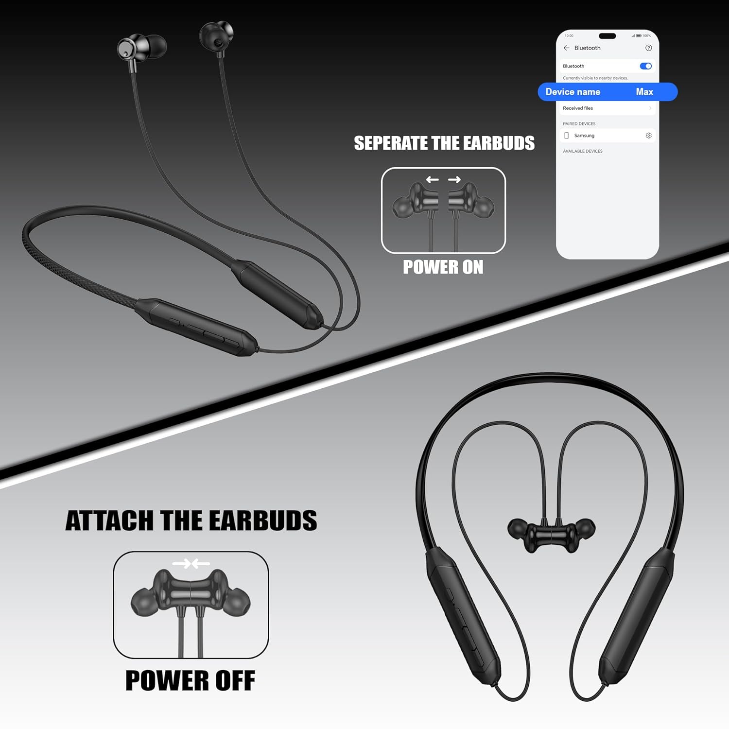 Magnetic Earbuds Design – This stylish Bluetooth neckband comes with magnetic earbuds that stick together and saves charge automatically, helping prevent tangling and offering a convenient, secure way to carry your earphones around the neck.