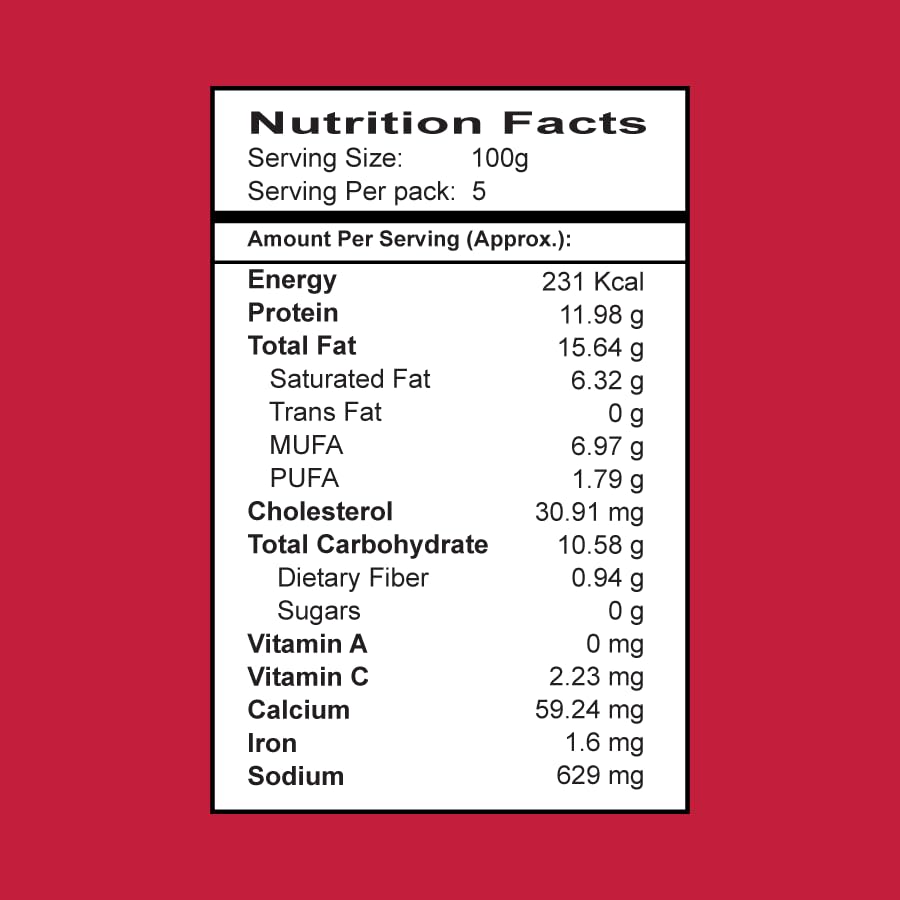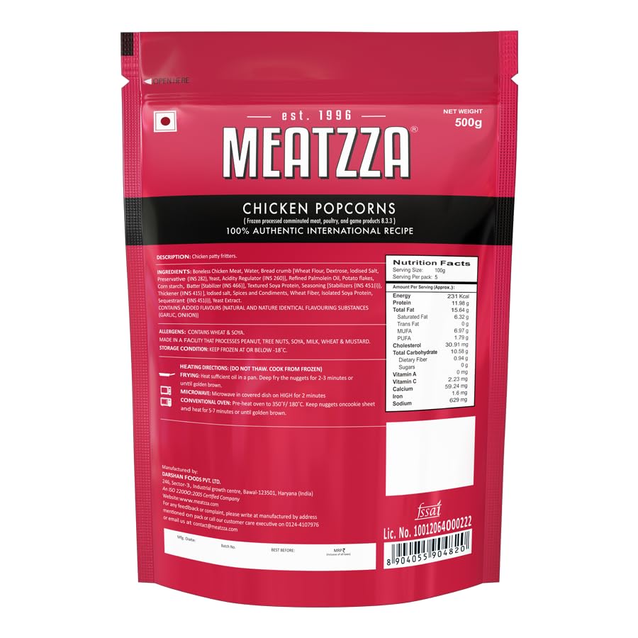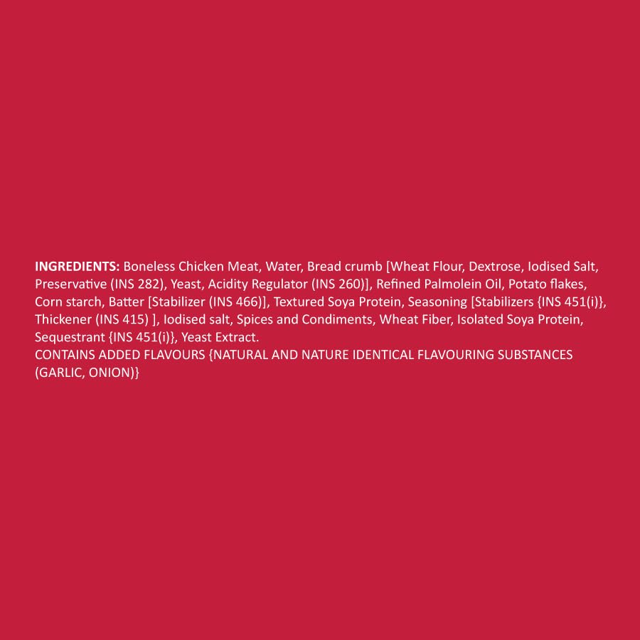Bread coated chicken popcorn, chicken meat, water, potato flakes, soya protein, starch, seasoning [ modified food starch-ins-1420, vegetable oil, rice flour, stabilizer ins-451 (i), yeast extract, salt sugar, wheat flour, garlic, natural flavouring (garlic, onion), onion, sugar, spice extract, thickener ins-415], iodized salt, dehydrated garlic powder, wheat fibre methyl cellulose.