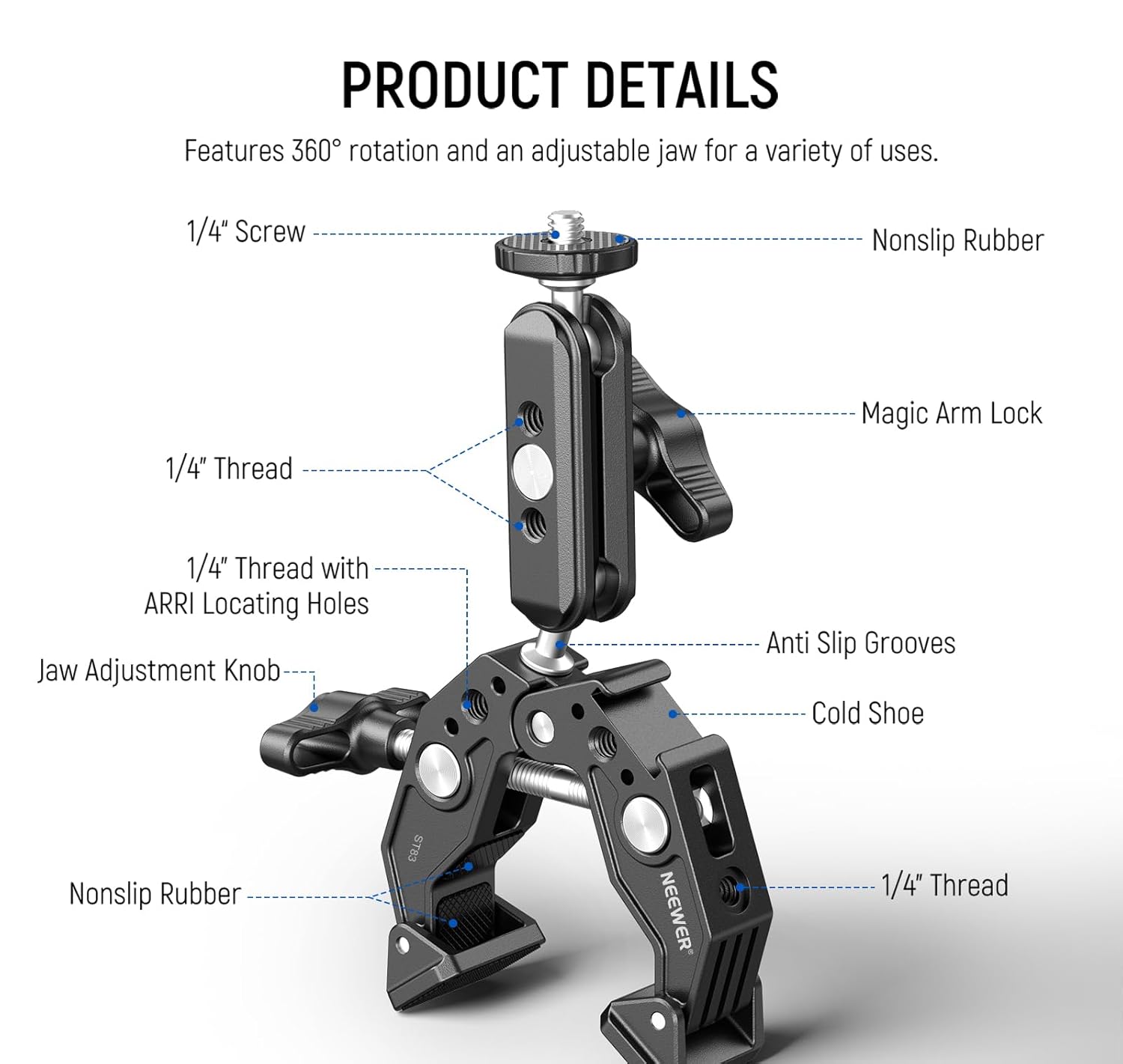 Multiple Mounting Points】 With 1/4″ threads, ARRI locating points and a built in cold shoe mount, the super clamp and magic arm with ball head can connect numerous accessories like a monitor, shoulder rig, and camera cage. The cold shoe mount for LED fill lights, microphones, and more (The maximum payload is 6.6lb/3.0kg. Not suitable for on camera speedlite flashes)