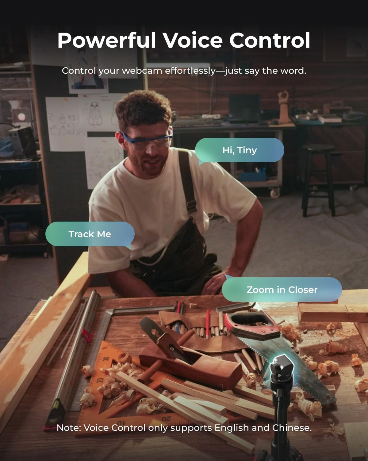 Smart Voice & Gesture Control: Control your webcam hands-free. Simply say commands like “Track Me” or use gesture controls to zoom, track, or switch presets. Perfect for seamless presentations, live streaming, workshops, and creative sessions.