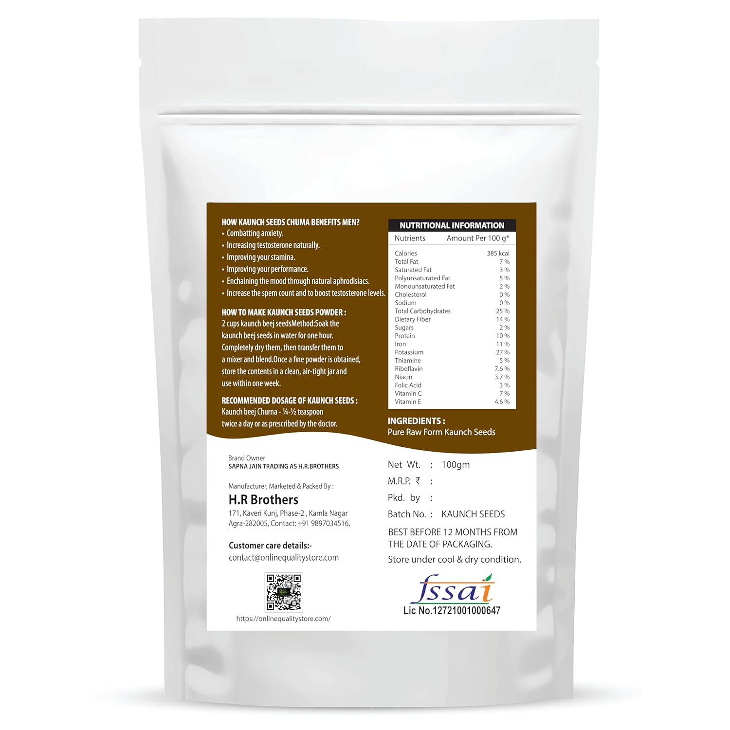 Package Contents: Combo Pack of 4 (Kaunch Seeds-100gm, Ashwagandha-100gm, Safed Musli Roots-100gm, Satawari-100gm). It Has a shelf Life of 12 Month.