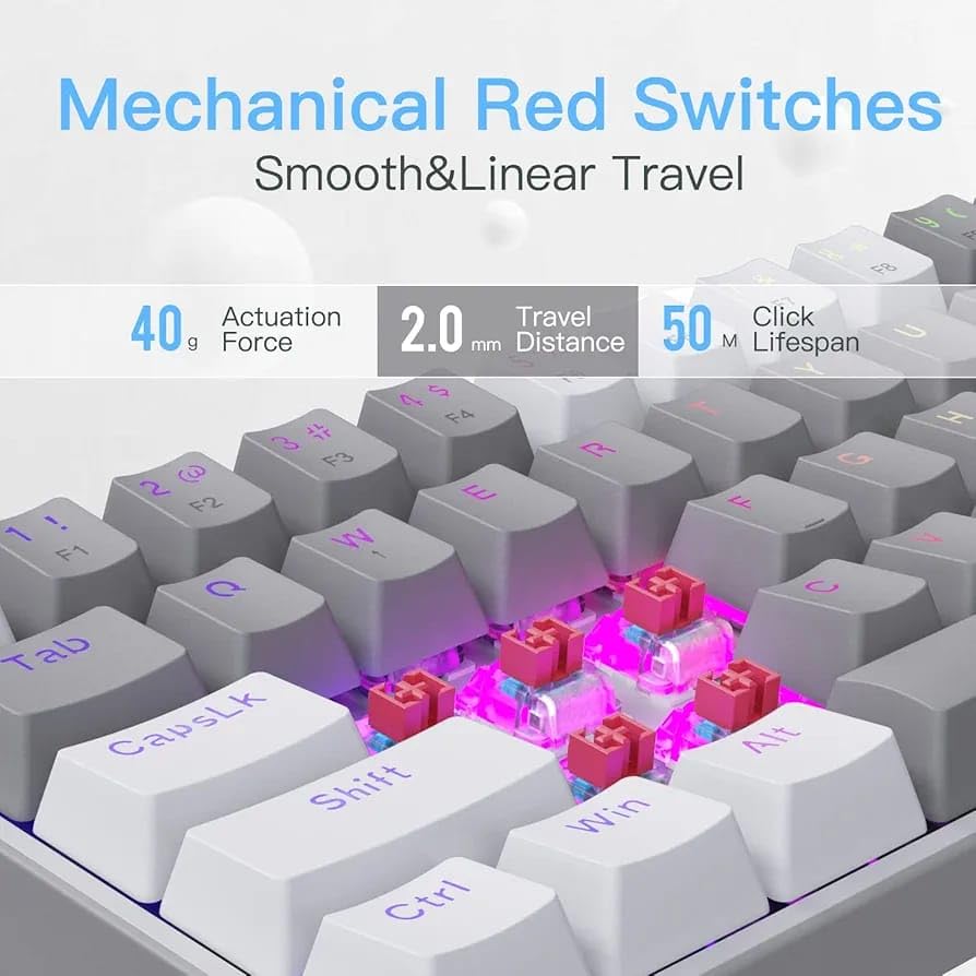 60% Wired & 2 Colors Keycaps: Redrogon 60% keyboard in wired mode with fresh 2 colors mixed keycaps layout. Ultra-compact 61 keys with novel keycap color frees up precious desk space with vibrant elements. Hot-Swappable Red Switches: Most quiet mechanical switch, linear and soft key travel makes every click easy to register. Hot-swappable with other switches. Made to last with switches rated for 50 million keypresses. Vibrant RGB: Up to 20 presets backlighting modes are free to choose by the keyboard itself. Brightness and flowing speed is also adjustable on board. Select your own preferred modes for any playing. Pro Software Customizable: Expand your options using the available software to design your own new modes and effects found on redragonshop. Macros with different keybindings or shortcuts for more efficient work and gaming. Dedicated for FPS Gamer: Place the keyboard proper straight on your desktop and no more crooked way for mouse space saving, your mouse will never hit the keyboard any more. Enjoy waving the mouse without any worries and go get that Team Kills.